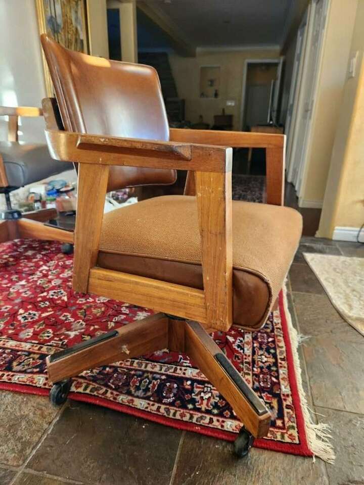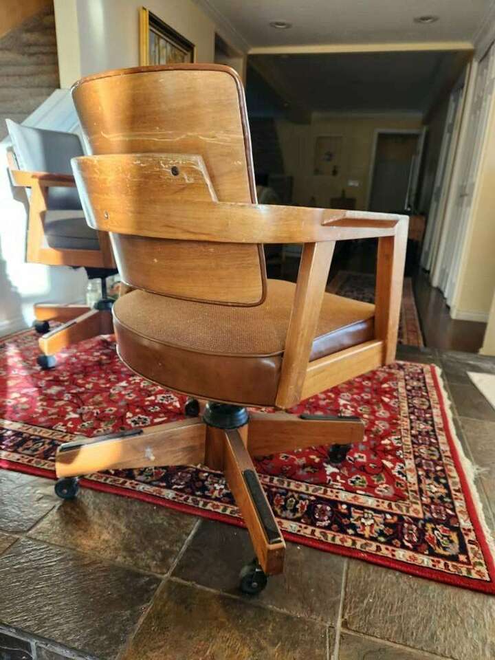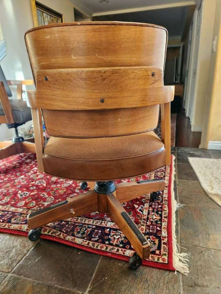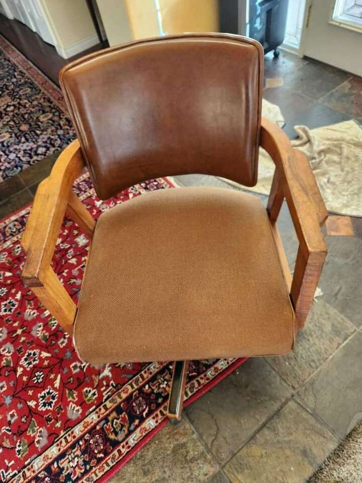 This Gunlocke oak/leather/fabric swivel chair is from 1940s and in great shape. No alterations have been done.