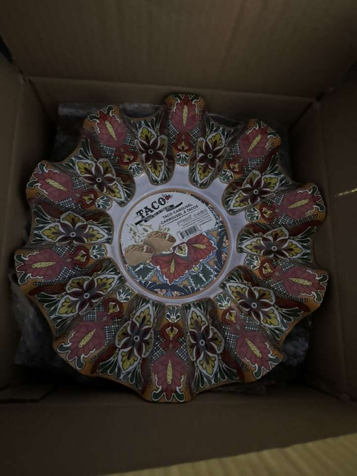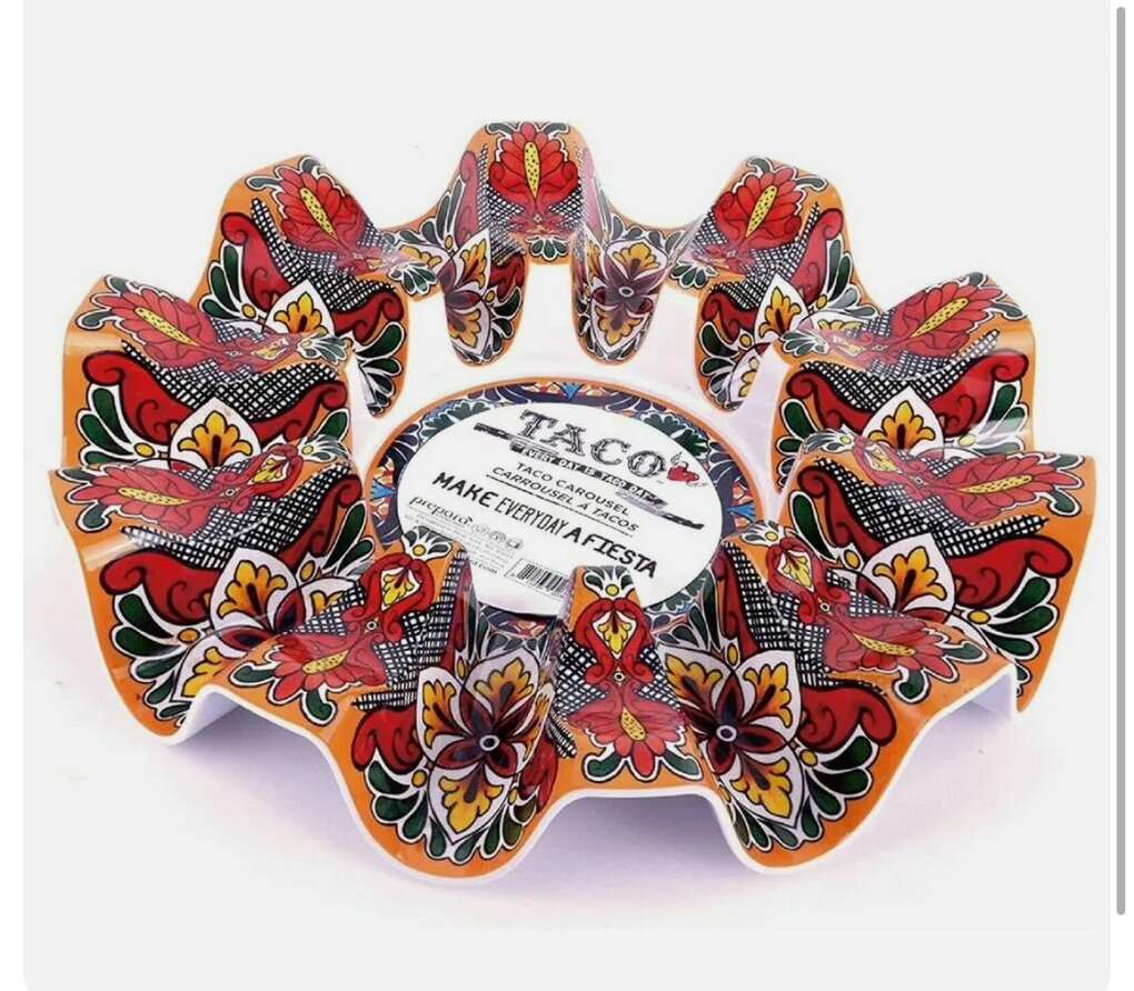 Fiesta pattern Durable melamine Holds up to 10 tacos Center area leaves room for a bowl of dip Great addition to your taco tuesday table or cino de mayo celebration Easy to clean - dishwasher safe Dimensions (inches): 13.5 X 14 X 13.5