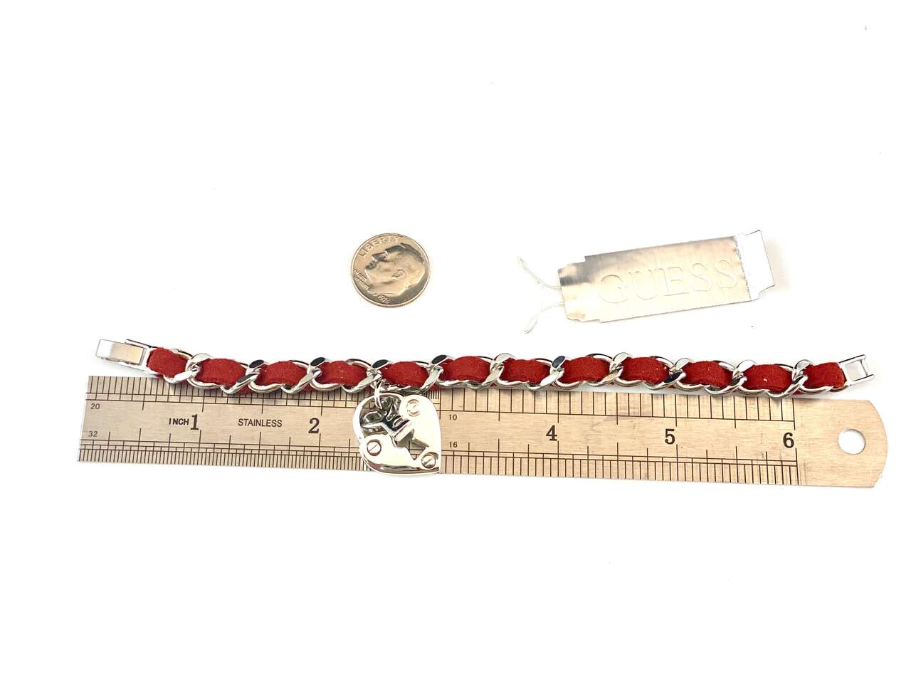 BRAND NEW - 7 inch GUESS BRACELET - Silver Link and Heart Lock N Key - Red Velvet Ribbon - C PIX. This would be a great gift for someone or treat yourself. See photos especially the second one of measurements. It might be closer to 6.5? It's really beautiful.