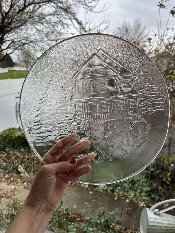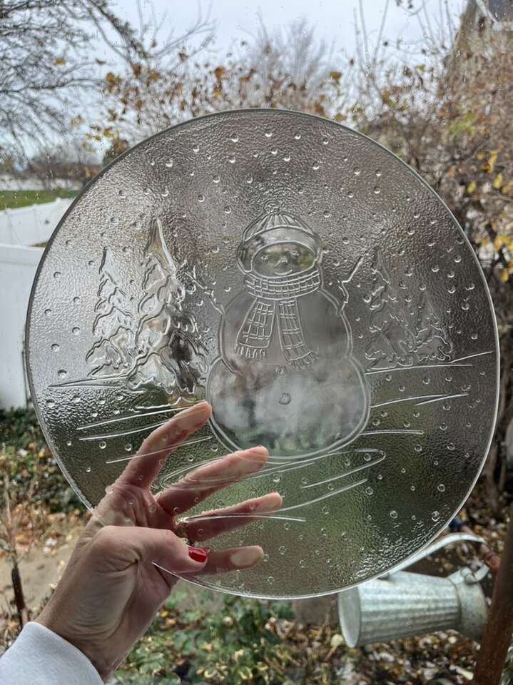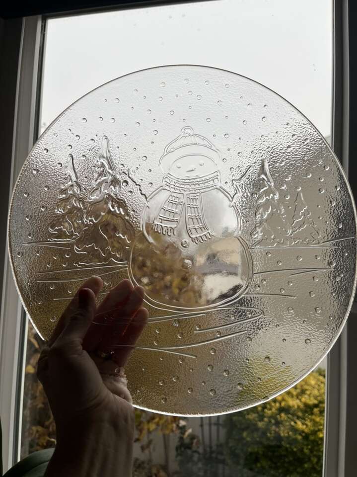 Set of thick XL clear glass plates (6) 13” wide snowman and Christmas scene