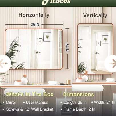 PILOCOS 24 x 36 inch bathroom wall mirror is made of HD glass and premium rose gold metal frame. Rectangle shape with rounded corner of the framed mirror features the modern style. Meets the decor needs to industry rustic and modern style of bathroom bedroom vanity entryway farmhouse hotel or salon. Stylish and Durable Ribbed Texture FramePILOCOS bathroom vanity mirror uses unique premium textured metal frame of this bathroom mirror Anodizing process makes the metal frame non-rusting and non-deformed can be used continuously for years adding luster to your home. HD Reflection and 5MM Shatterproof Glass A wonderful bathroom mirror is always combined with several craftwork layers. Excellent silver plated layer provides HD refection without any distortion on the wall mounted mirror. And shatterproof film is the important layer to keep people safe once the mirror is broken in accident. Easy to Install PILOCOS wall mounted bathroom mirror is very easy to install the package comes with wall hardware pegs and screws just use the screws to nail the hardware pegs to the wall and hang the mirror horizontally or vertically afterwards.