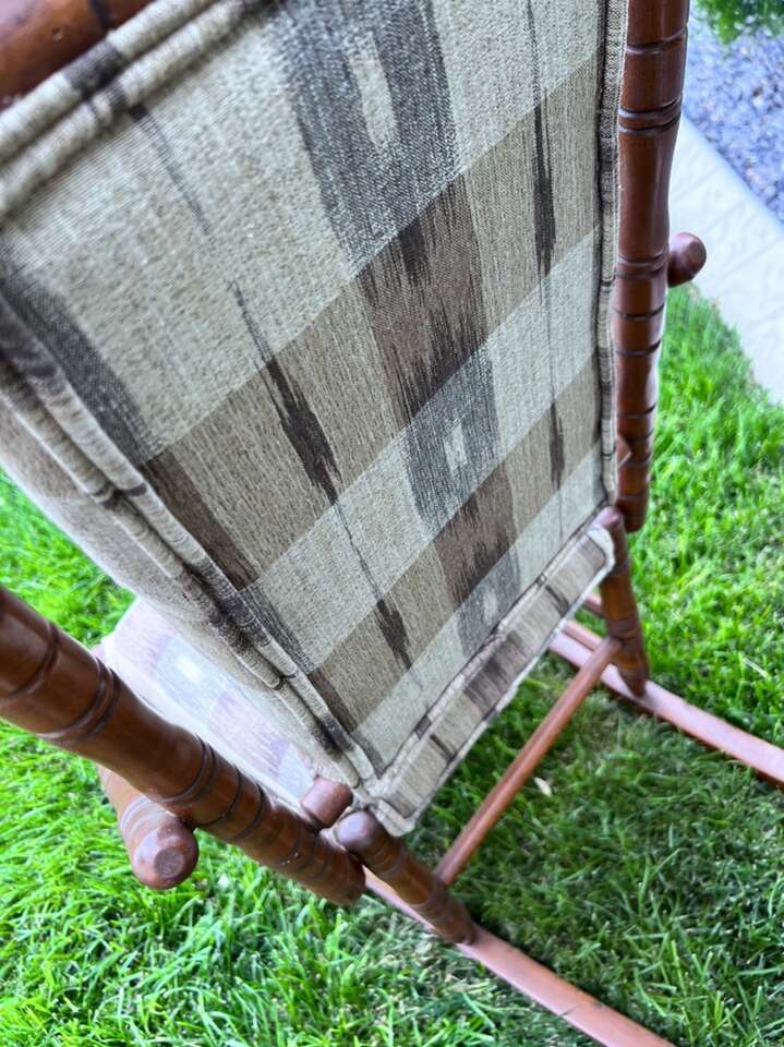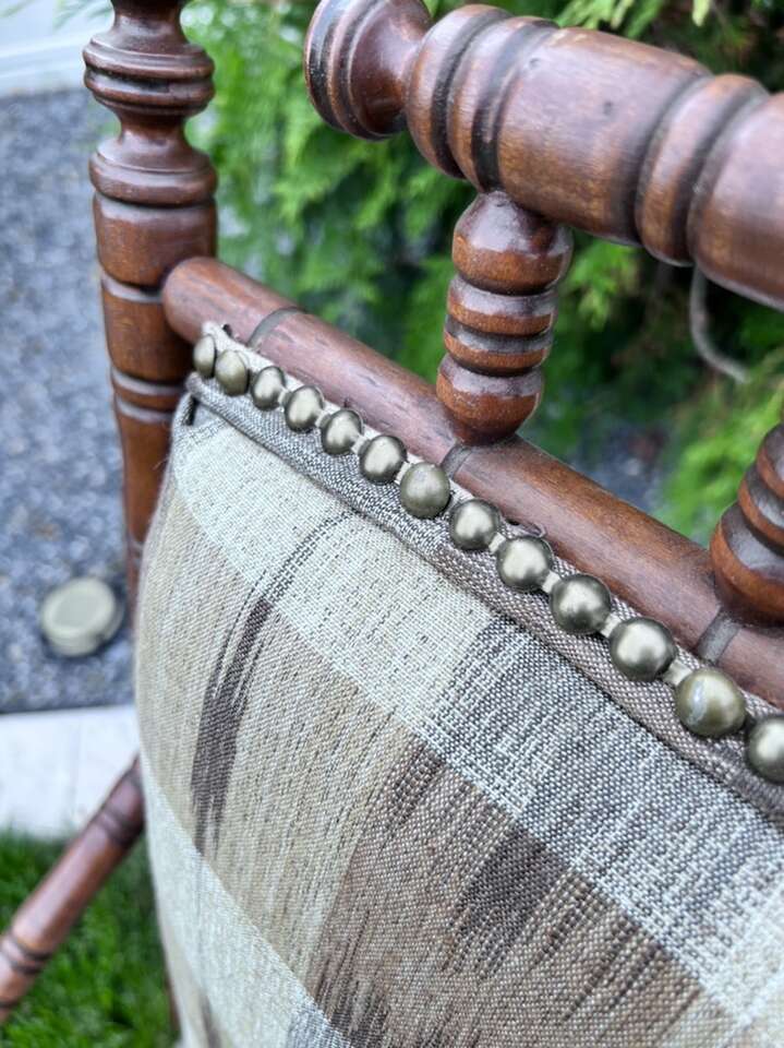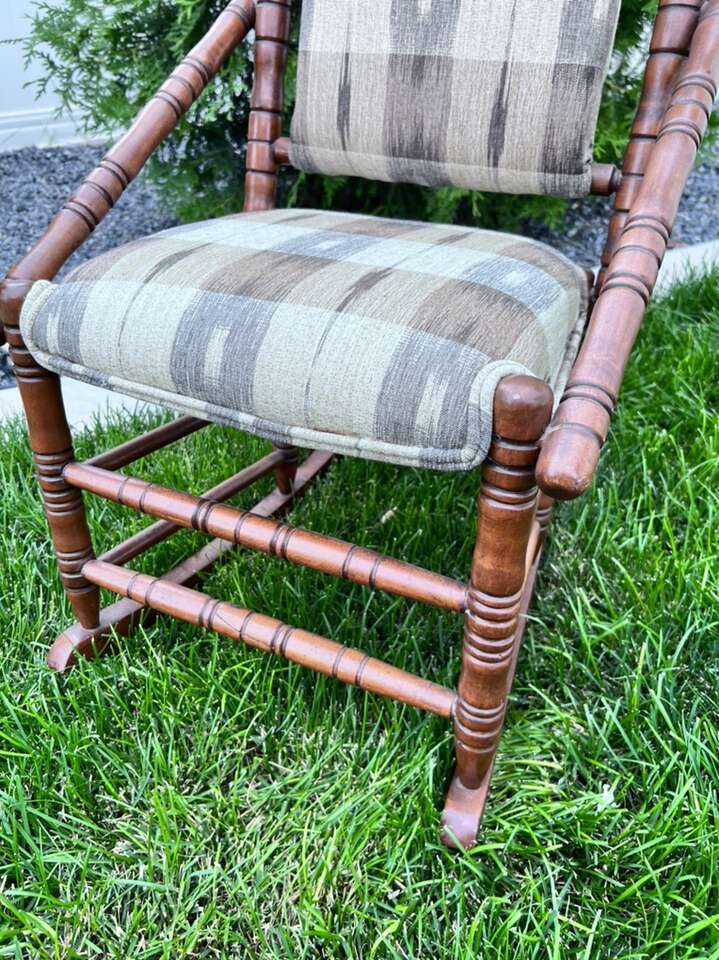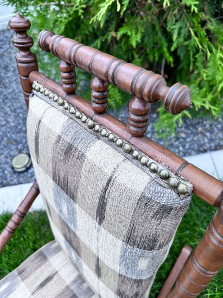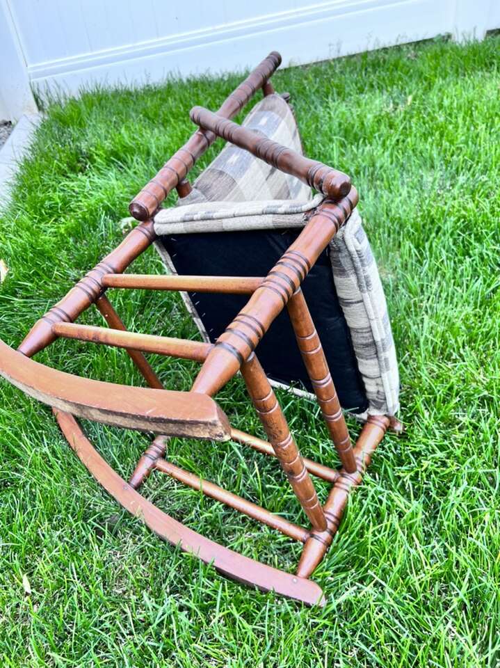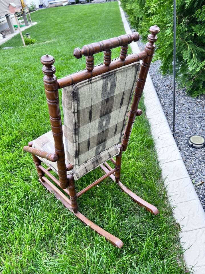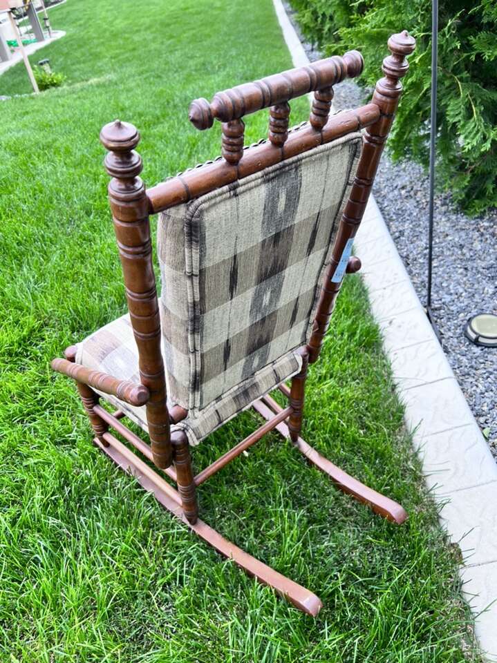 Well made antique rocking chair child size that has been professionally re-covered. Purchased in South Carolina. Has lots of turnings. Even looks better in person. 34”h x 18”w x27”deep.