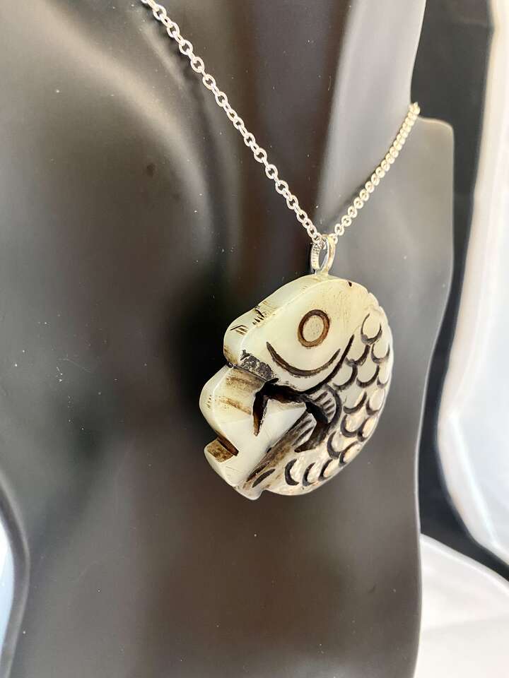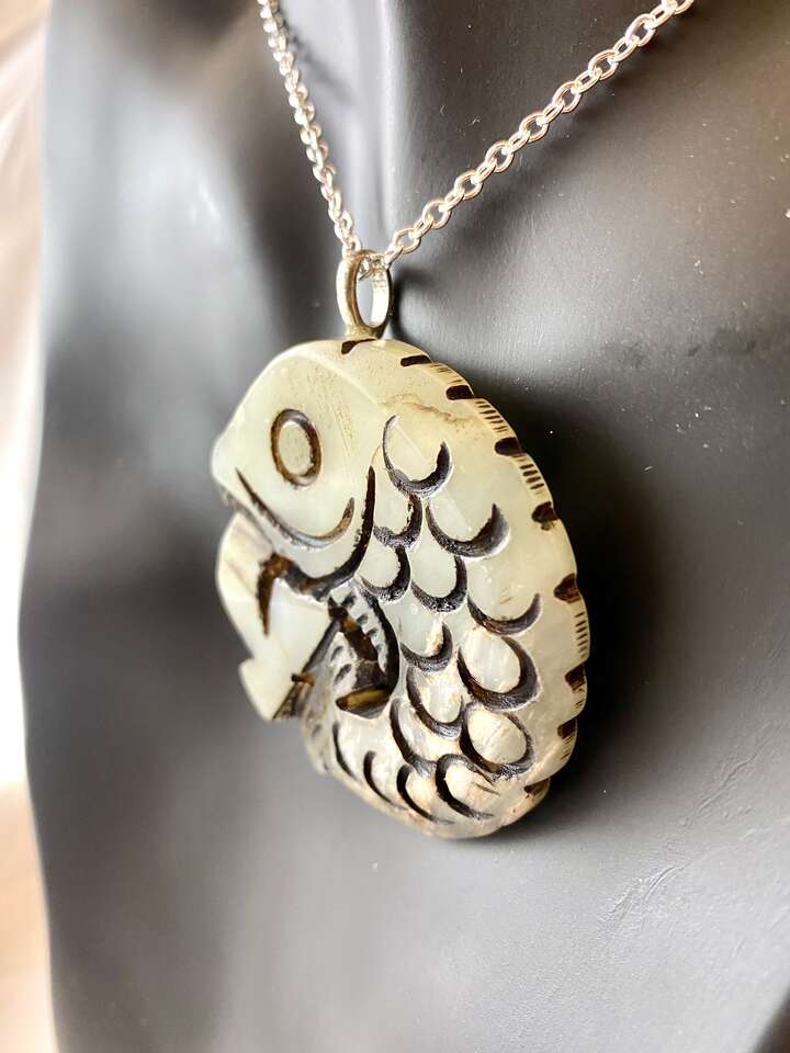 NEW - Large 2.25 inch Engraved Detailed Fish PENDANT on A Thick Natural Stone - Light Green - C PIX. This is such a unique pendant that will easily slide on most chains of your choice.
