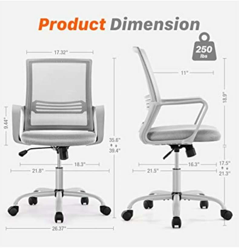 The product is compact, with an overall dimension of 26.37’’ X 21.65’’ * 35.6-39.4’’ (L x W x H). Grey office chairs, desks chairs, dirt-resistant, easy to clean. Product weight 22.5 lbs, easy to carry. Suitable for office, entertainment, learning crowd.