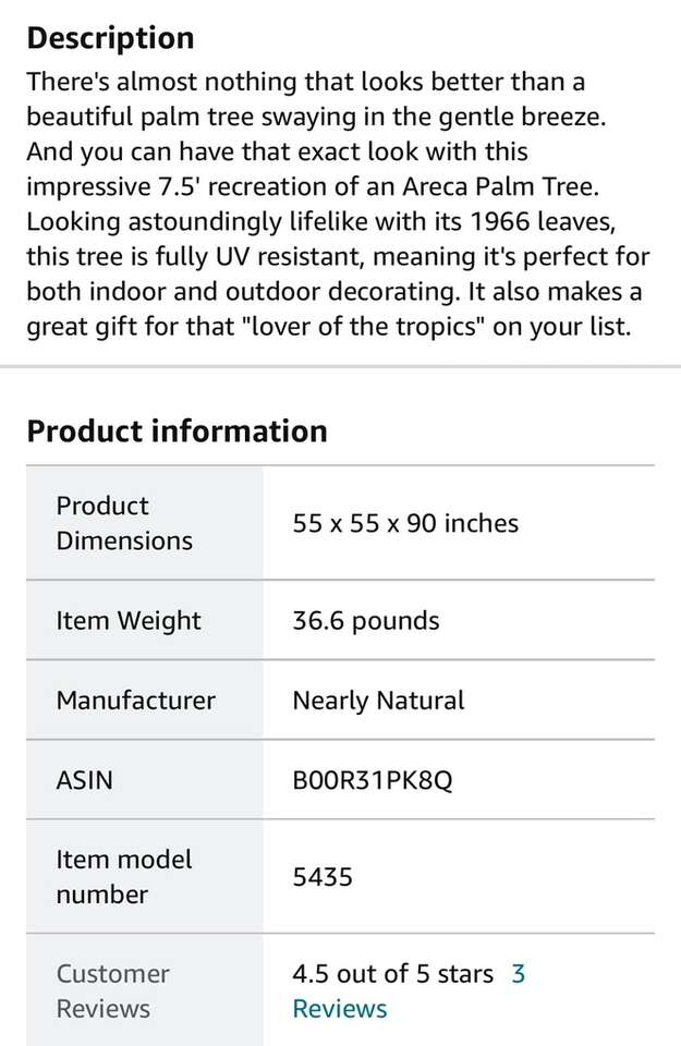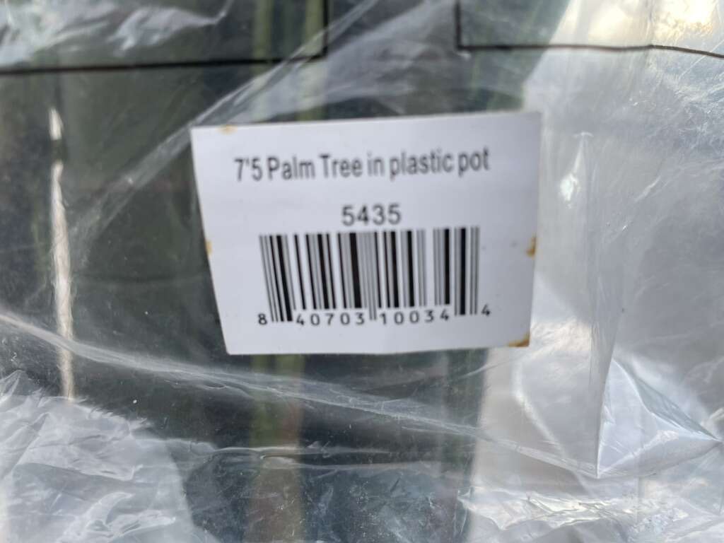 Description- 7.5’ Tall artificial Areca palm tree that is UV resistant for indoor or outdoor use. See photos for more product information and specifications.