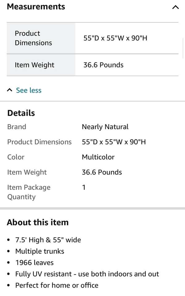 Google “nearly natural 5435” and you will find that it currently sells at at most retailers for $500-$700. It’s over $550 on Amazon and the best price I could find for it was $465.59 plus sales tax at Home Depot. I’M SELLING IT 70% LESS THAN HOME DEPOT!
