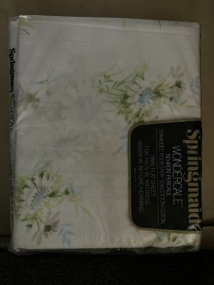 Venmo3- Available 2- light green 1 white with a blue daisy flower pattern. Vintage NIP Springmaid Wondercale No Iron Percale 50% Kodel Polyester*/ 50% cotton/cotton Twin Flat Sheet For 39" x 76" Mattress made in U.S.A. $29 each or all three for $75.