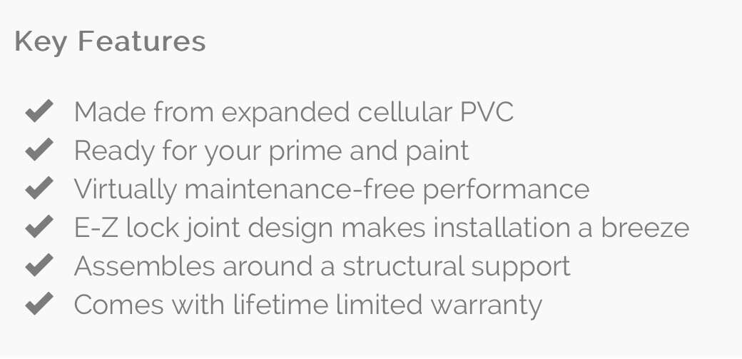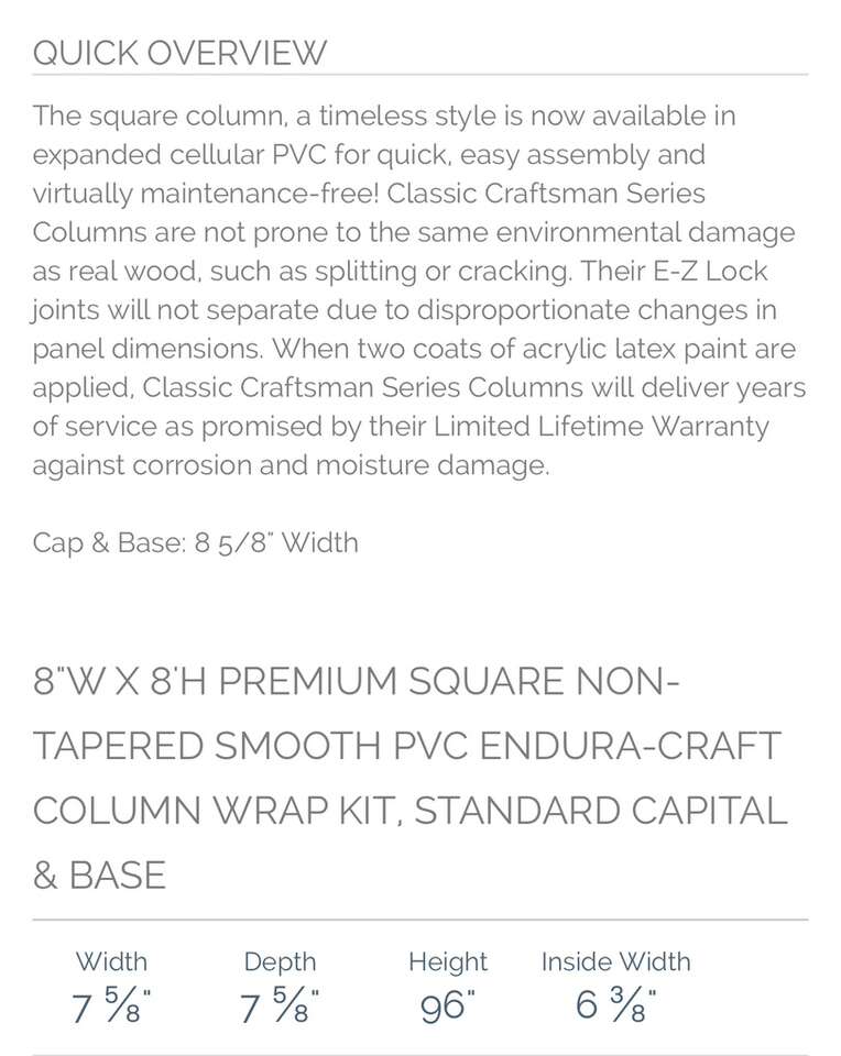 Description- 8” x 8” x 8’ Tall craftsman classic square non-tapered smooth column kit. This is just the square column kit (as shown in the third picture). Some of the other photos show using trim pieces to illustrate what is possible starting with this kit as a base. See photos for more product information and specifications.