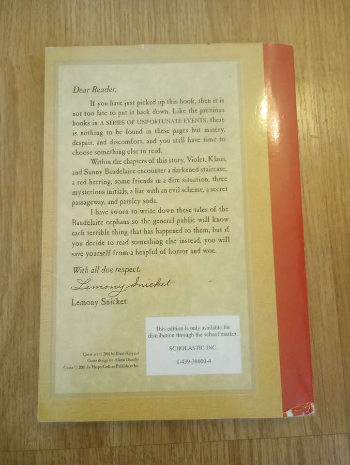 Used, paperback copy of book #6 in A Series of Unfortunate Events~The Ersatz Elevator. By Lemony Snicket. Book has some normal wear and tear as well as some writing on the top pages. Other than that there is no writing on or in the book. Still in fair condition and the pages themselves are in great condition. From a smoke-free home. $3 cash or Venmo. Will hold with Venmo. Text if interested. Feel free to check out my other ads-lots for sale including lots of books and other items.