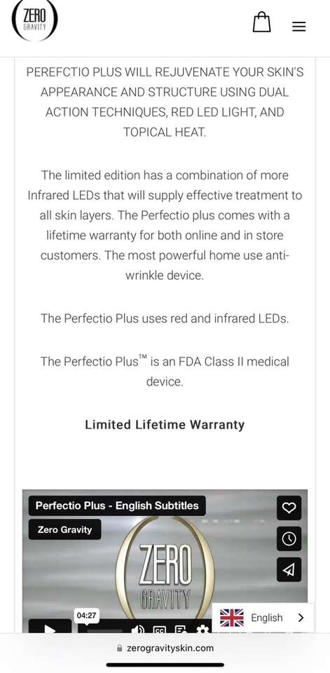 The Perfectio+ treatment probe (metal head) will heat up to 40° to 42° Celsius (104° to 107° Fahrenheit) to provide topical heating that increases local blood flow at the treated area. Red and infrared light treatment is completely safe and has no reported side effects. Perfectio+ is clinically proven and was found safe to use. Perfectio+ comes with a lifetime warranty. ZERO GRAVITY has invested a great deal of time and resources in the development of the anti-aging Perfectio+ device. In order to prove the power and effectiveness of all ZERO GRAVITY products, independent clinical studies were conducted, most notably and recently by Princeton Research Division in Princeton, New Jersey.