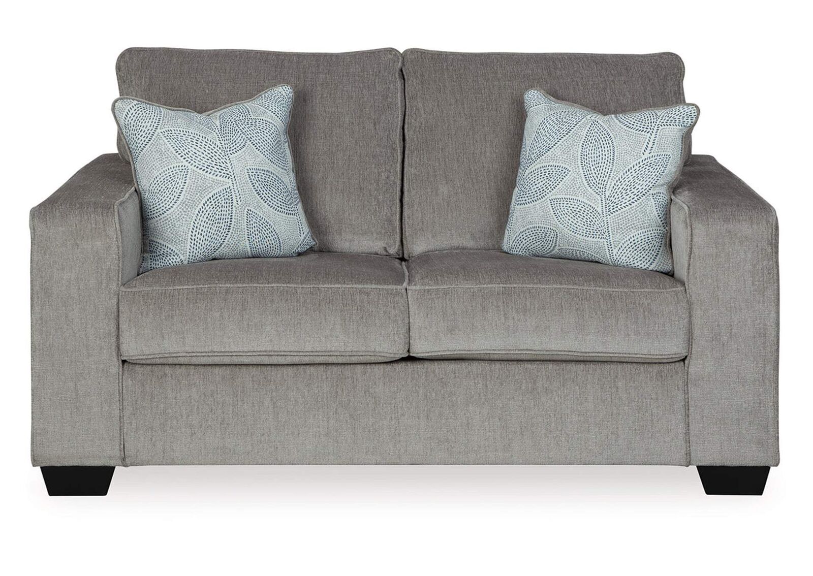 If style is the question, then this loveseat is the answer. Sporting clean lines and sleek track arms, the decidedly contemporary profile is enhanced with plump cushioning and a chenille-feel upholstery, so pleasing to the touch. Sure to play well with so many color schemes, this loveseat in slate gray includes a pair of understated floral pattern pillows for fashionably fresh appeal.Corner-blocked frame