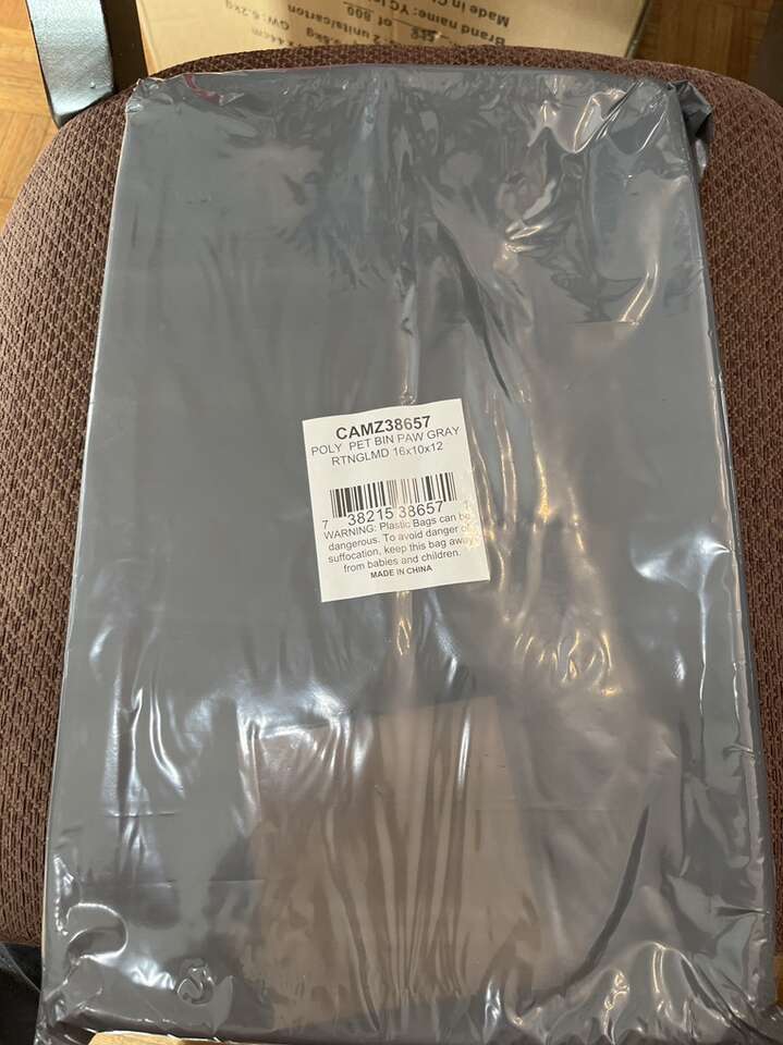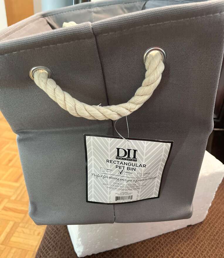 Brand new still sealed in package. First photo is one pulled out we kept. Medium sized 16 length 10 wide and 12 high with rope sides. 100 percent polyester.