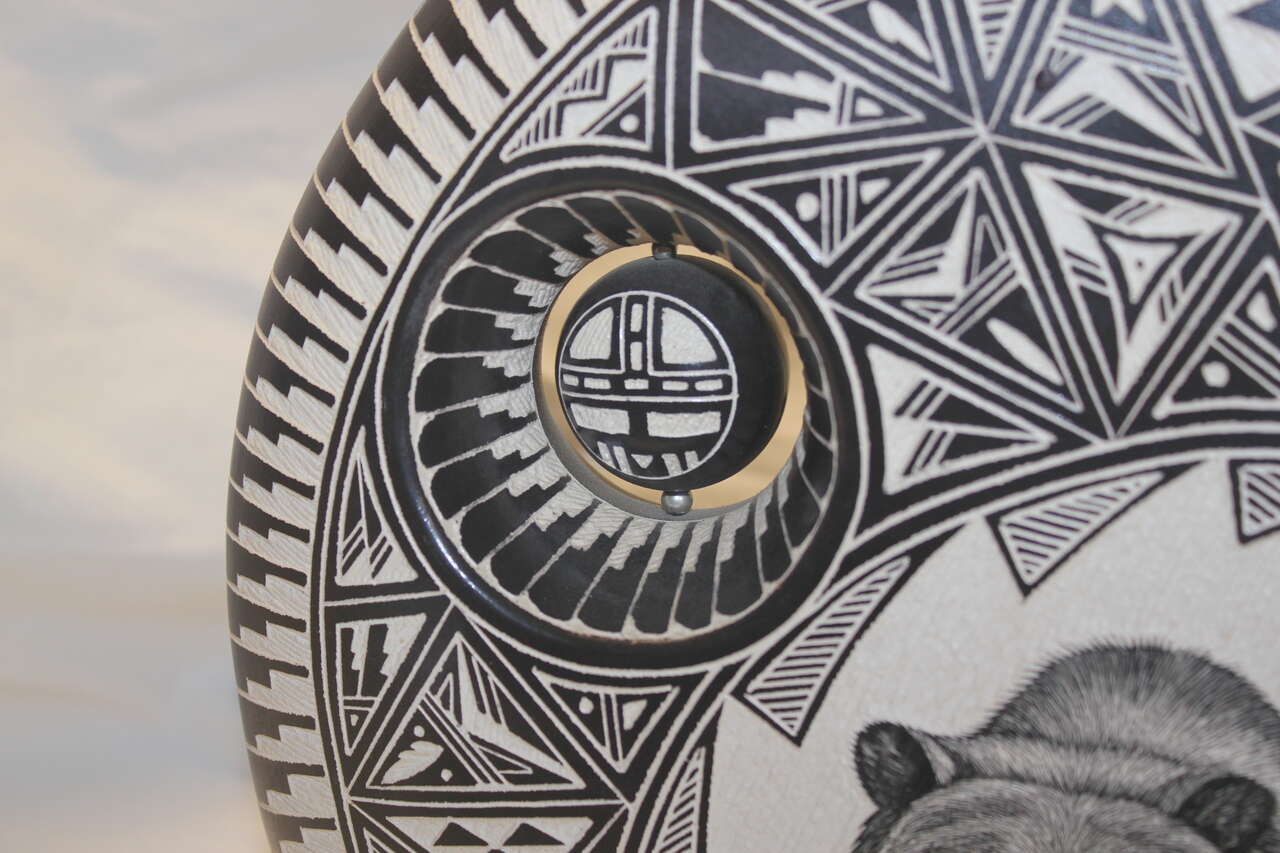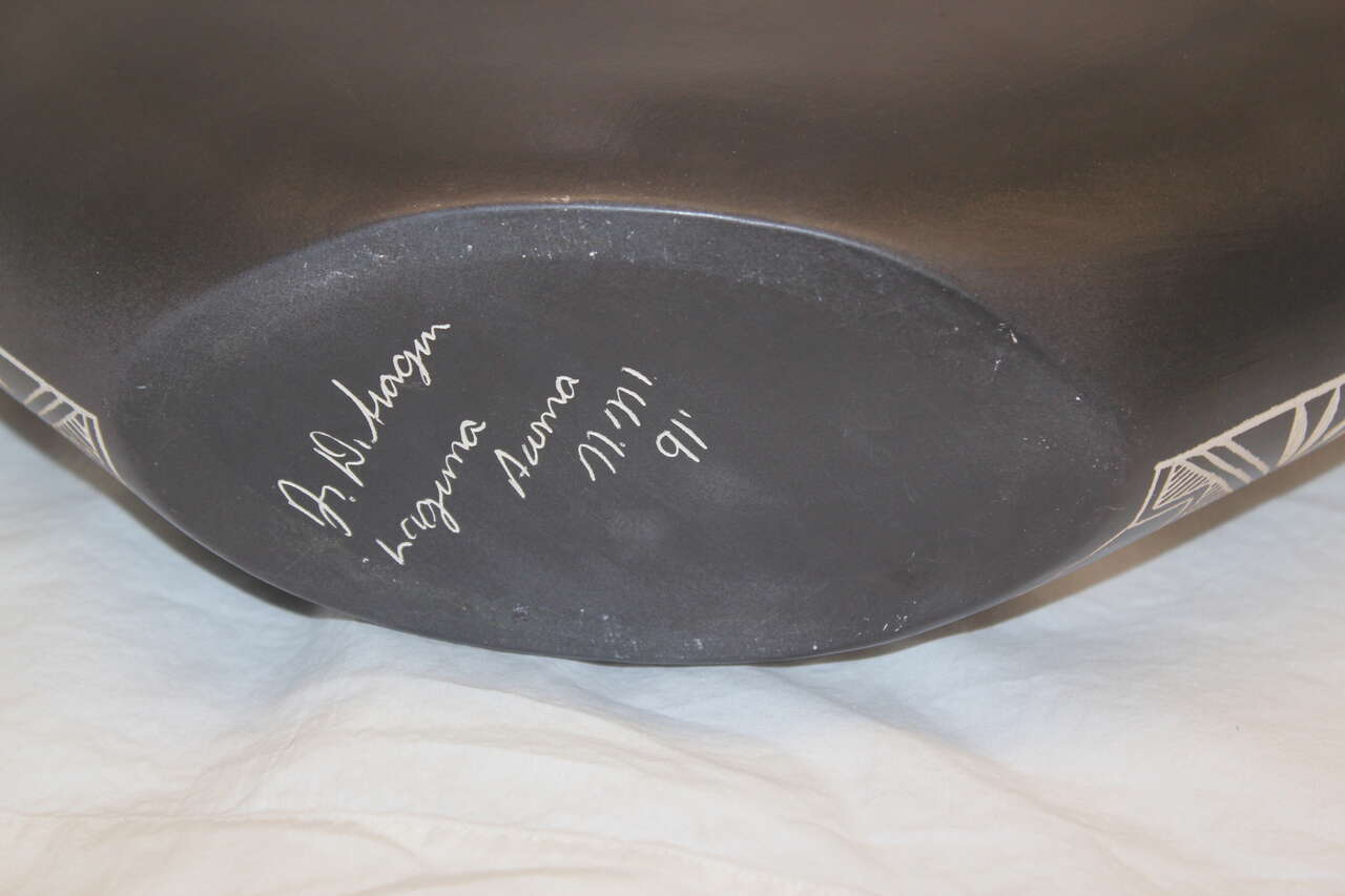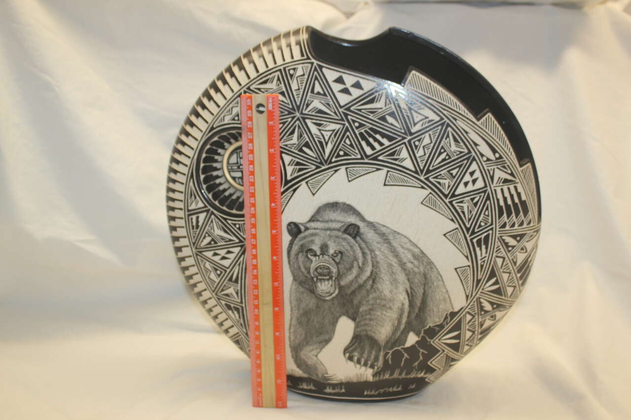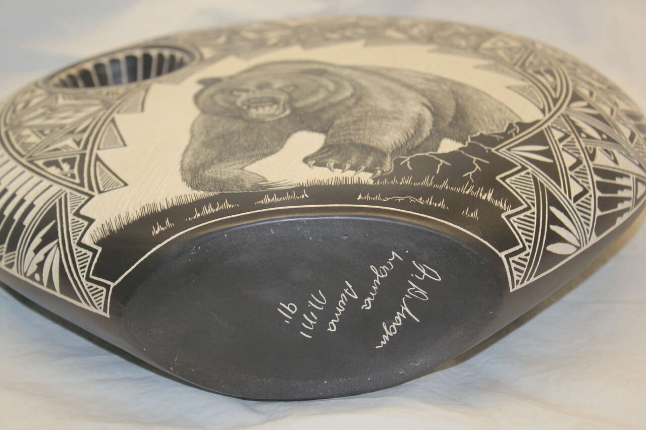 Selling my intricate and beautiful native american pottery black and white vase with traditional patterns as well as fine line work grizzly bear (reminiscent of scrimshaw). Vase is quite large (15x15) and in perfect condition with no chips. It was made by JR and Diane Aragon (husband and wife team) in 1991. They are from the Acoma Pueblo in Laguna New Mexico. The piece is signed by them on the bottom. Very striking and interesting piece of pottery. I have had this for many years protectively packaged because I did not have room to properly display. Still don't have a good display location so maybe it case find a new home but the intricacy of the works still captivates me today.
