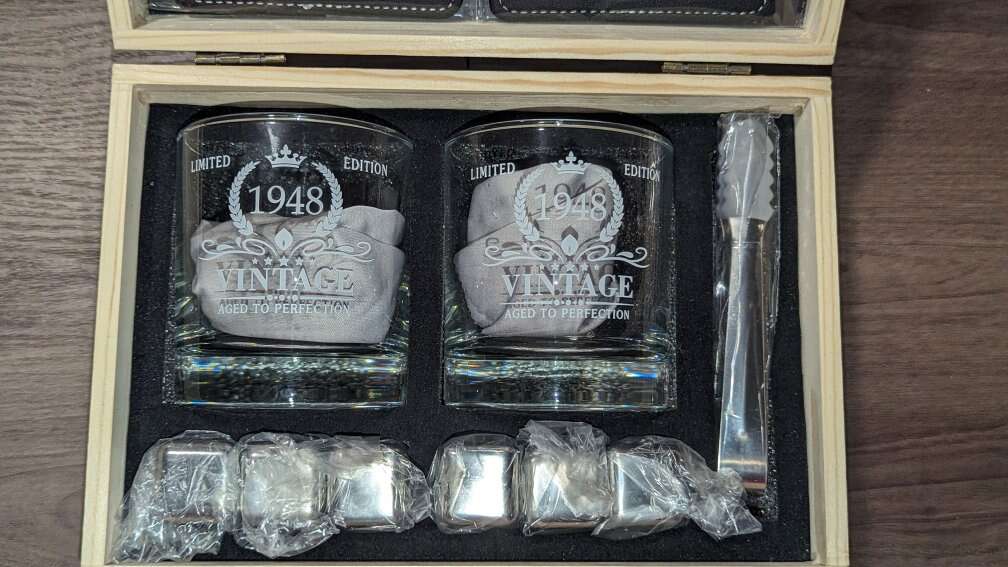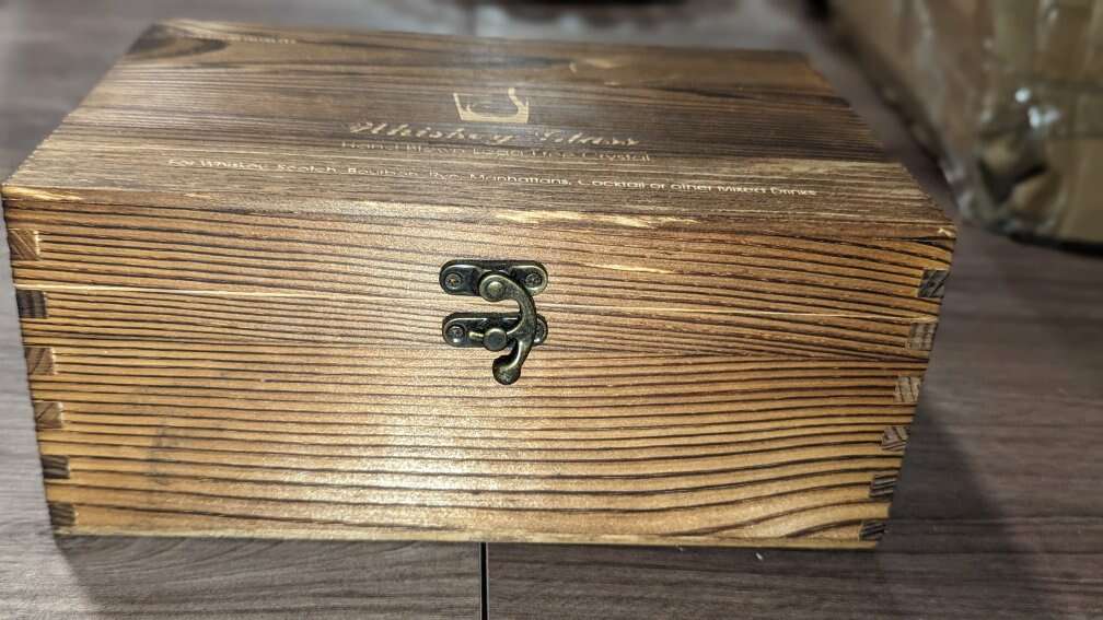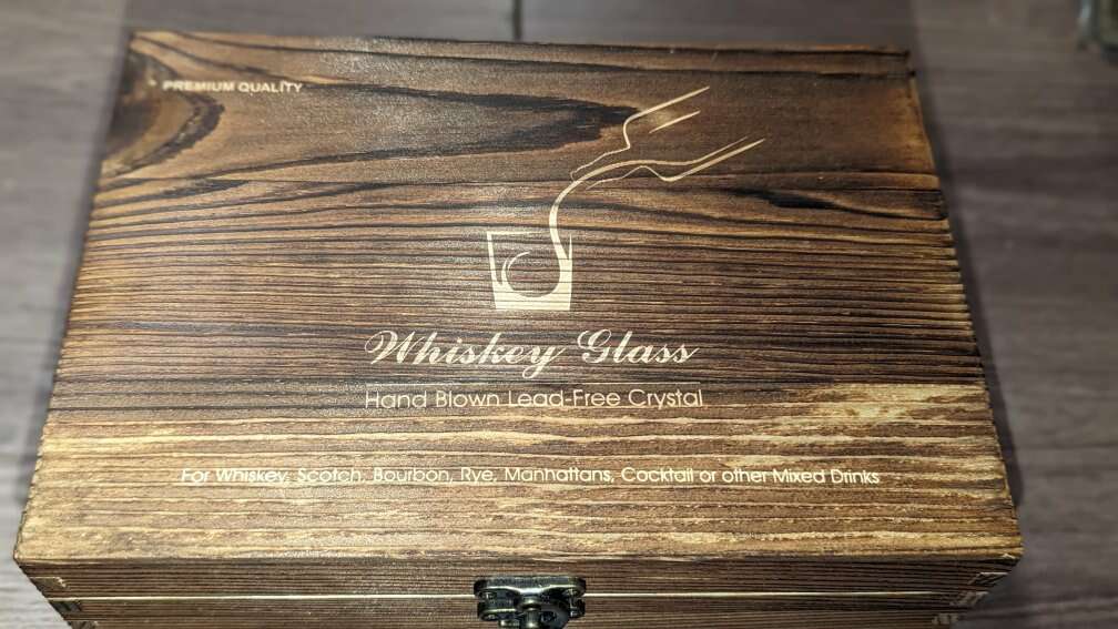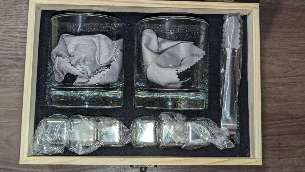 Brand New. In the box. 2 glass whiskey stones gift set box includes 2 crystal whiskey glasses, 8 stainless steel whiskey chilling stones, 1 anti-slip silicone-tipped tong and 1 velvet storage bag, all presented in an exquisite wooden box with the delicate engraved pattern.