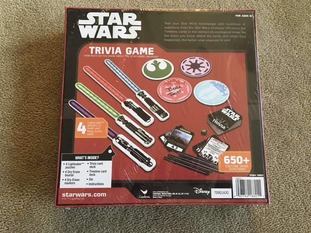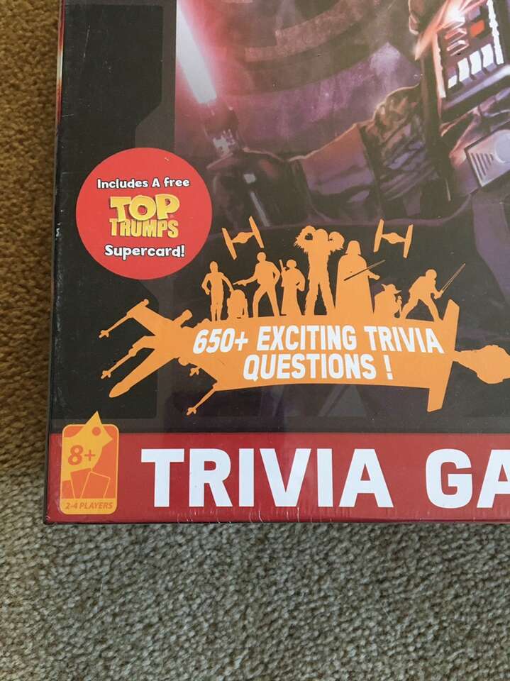 NEW (sealed in plastic) Star Wars Trivia Game: How much do you know about the Star Wars universe? 650+ exciting trivia questions! Ages 8+, 2-4 players. Includes collectible Tops cards. By Disney & Cardinal Games. New, unopened condition. Text only. Cash or Venmo.