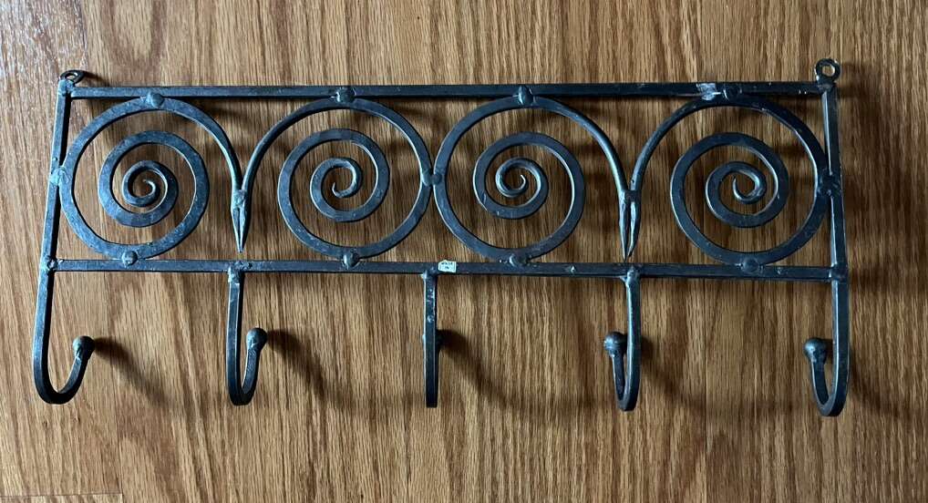 Brown metal/rod swirl/spiral 5 hook coat/towel/hat/purse/key hanger. Dimensions: 7,5” wide x 17” long. Great addition to any room. $12