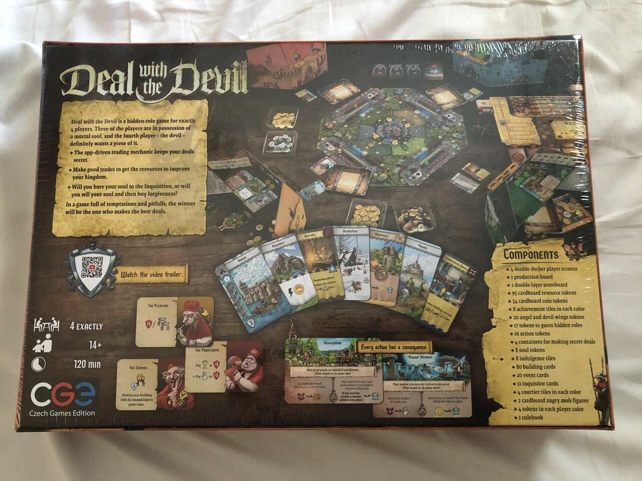 Deal with the Devil is a deeply thematic competitive Eurogame set in a fantasy medieval era. Each of the four players takes on a secret role of a mortal, a cultist, or even the Devil. Due to the asymmetrical roles, players experience the same game but with different game goals every play.