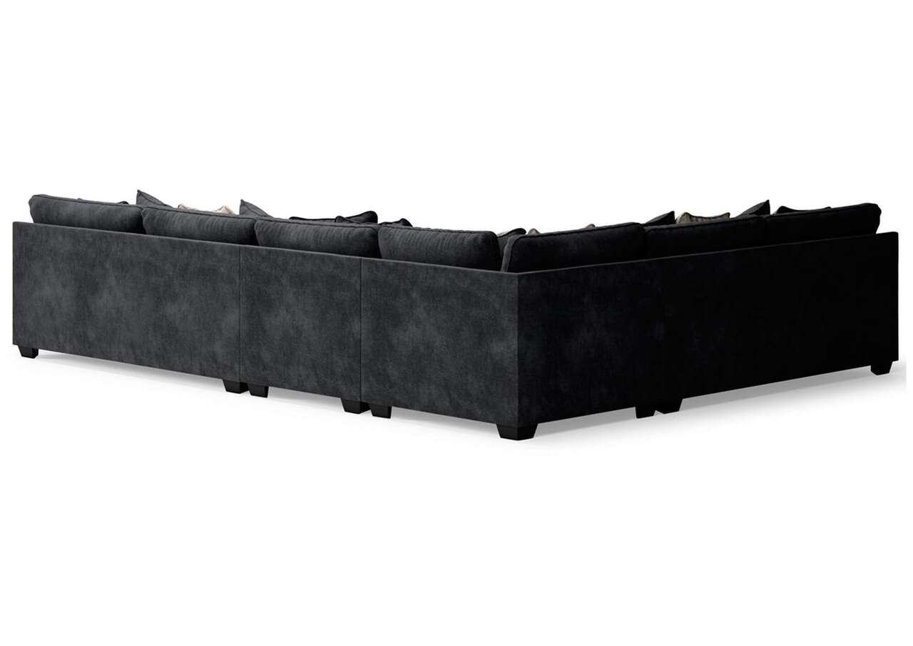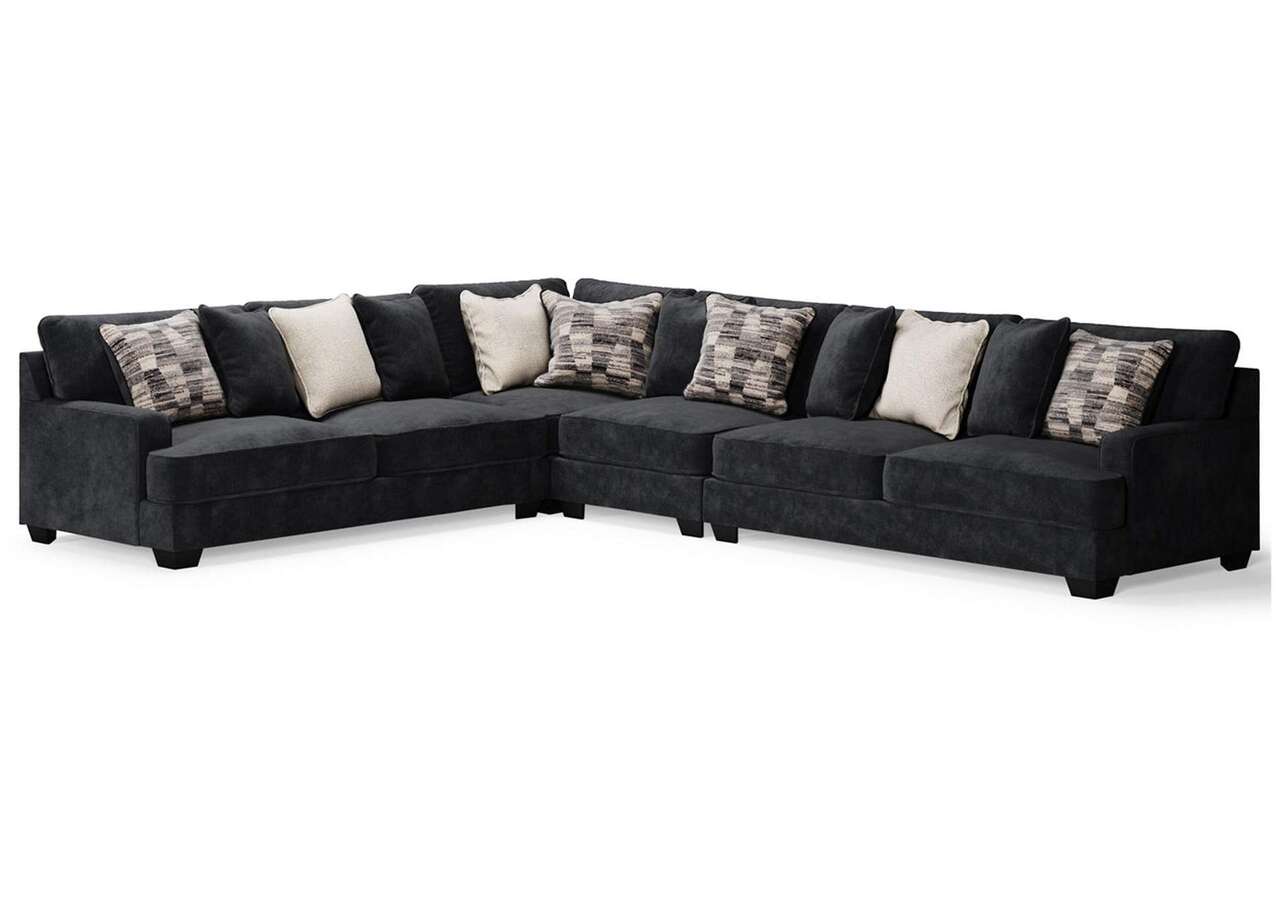A match made in heaven, this sectional marries a cool, contemporary look and a decadently soft, plush microfiber feel. This irresistibly comfortable union is love at first touch at the end of a long day, or anytime you're ready to get serious about relaxing. Say I do to big-time comfort and style flanked by neatly finessed track arms in a clean, straightforward design. A medley of pillows in cream, black and gray blends effortlessly with any setting.Includes 4 pieces: left-arm facing sofa, wedge, armless chair and right-arm facing sofa