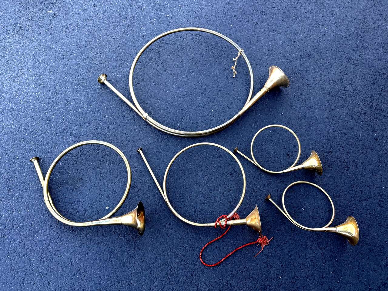Vintage Christmas Brass Horn Bugle Trumpet French Fox Hound Wall Hanging. $10 for each small size, and $20 for the large