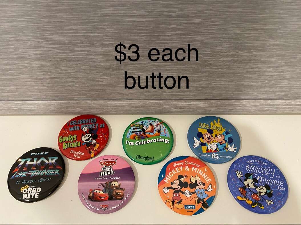 Most are priced in the pictures. All buttons and pins are authentic genuine Disney Parks trading pins. Pins labeled “cast exclusive” are pins that were only given to cast members of the Walt Disney Company, was not available or sold to theme park guests. Own a piece of Disney history!