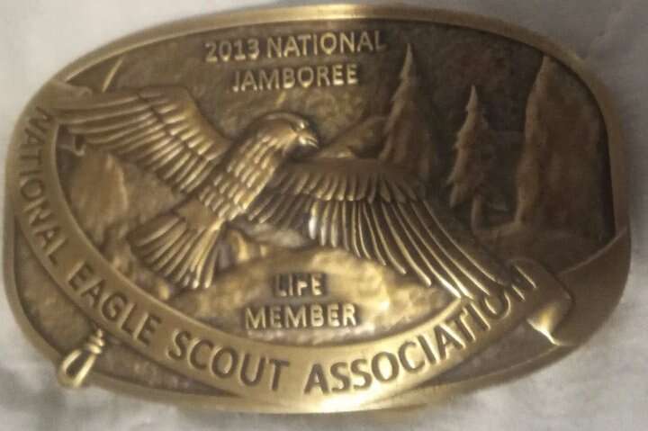 Boy Scout Stuff This Boy Scout Cyper Chip Award is a must-have for any collector of historical memorabilia. The insignia patch is a symbol of the skills and knowledge necessary to use technology safely and responsibly, making it a highly sought-after item for fans of the Boy Scouts and fraternal organizations. Featuring the iconic Boy Scouts logo and the words 'Cyber Chip' in bold letters, this badge is a perfect addition to any collection. Whether you're a long-time collector or a newcomer to the world of historical memorabilia, this Boy Scout Cyper Chip Award is sure to impress. This BOY SCOUT belt loop comes with 9 metal achievement merit award badges. The loop is designed to hold the badges securely and can be easily attached to any belt. The badges represent various accomplishments and skills learned in the Boy Scouts organization and can be proudly displayed on the belt loop. They include camping, swimming, family life, First aid, physical fitness, environment, hiking, cooking etc. The badges are in great condition and will make a perfect addition to any Boy Scouts memorabilia collection. Whether you are a collector or a former Boy Scout, these belt loops with its badges is a unique and valuable item that you do not want to miss out on. This brass belt buckle features a majestic eagle, a symbol of the Boy Scouts of America. It's perfect for any Boy Scout or collector of historical memorabilia. The buckle is designed to fit on a Scout belt and is an excellent addition to any uniform. The buckle is new and has never been used. It is made of high-quality brass and is sure to last for years to come. Any fan of the Boy Scouts or collector of fraternal organizations memorabilia will appreciate this unique and beautiful piece. Also includes Norman Rockwell brand new handkerchief. Add it to your collection today