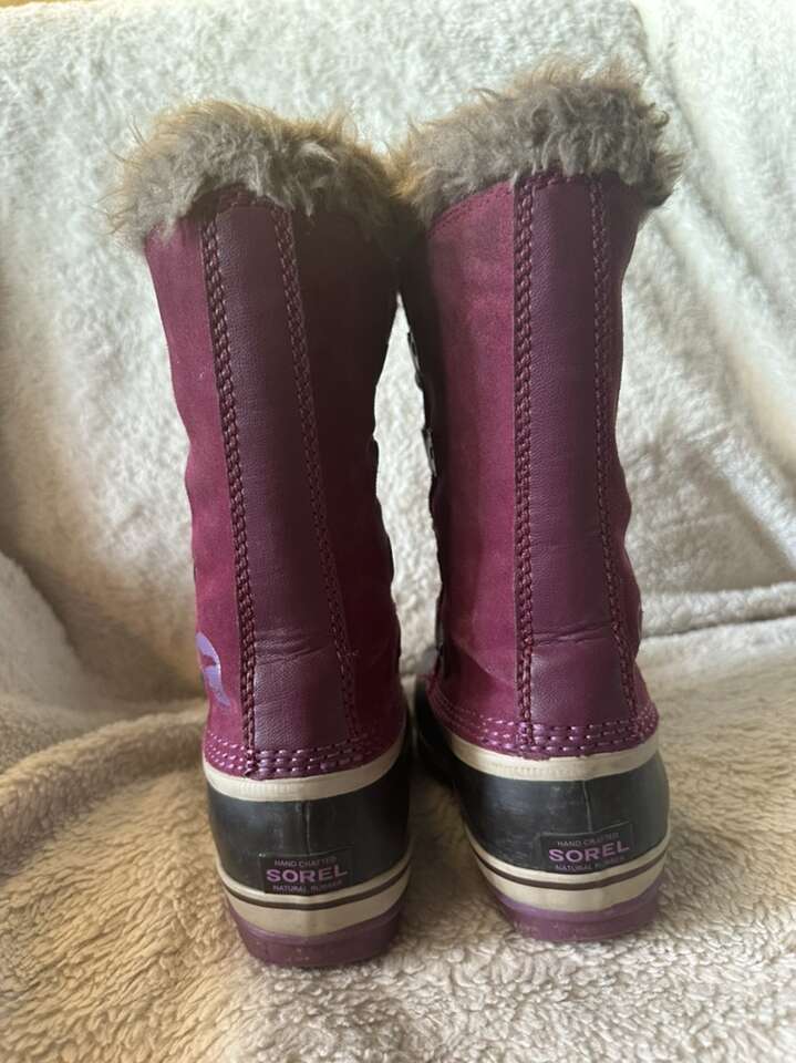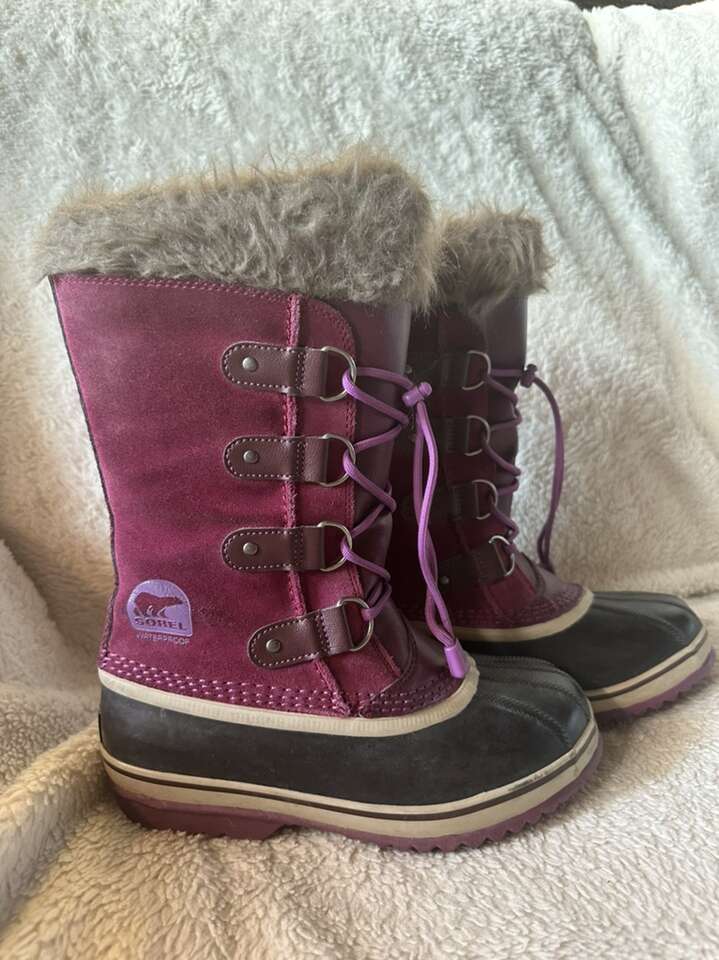 Sorel youth size 4 waterproof winter snow boots. These have purple leather uppers and a black rubber foot bed. Also fur trim at the top. They are in excellent condition. See photos for details. I take cash or Venmo. Text is best. 801-201-4446. Check out my other ads for additional sizes and styles.