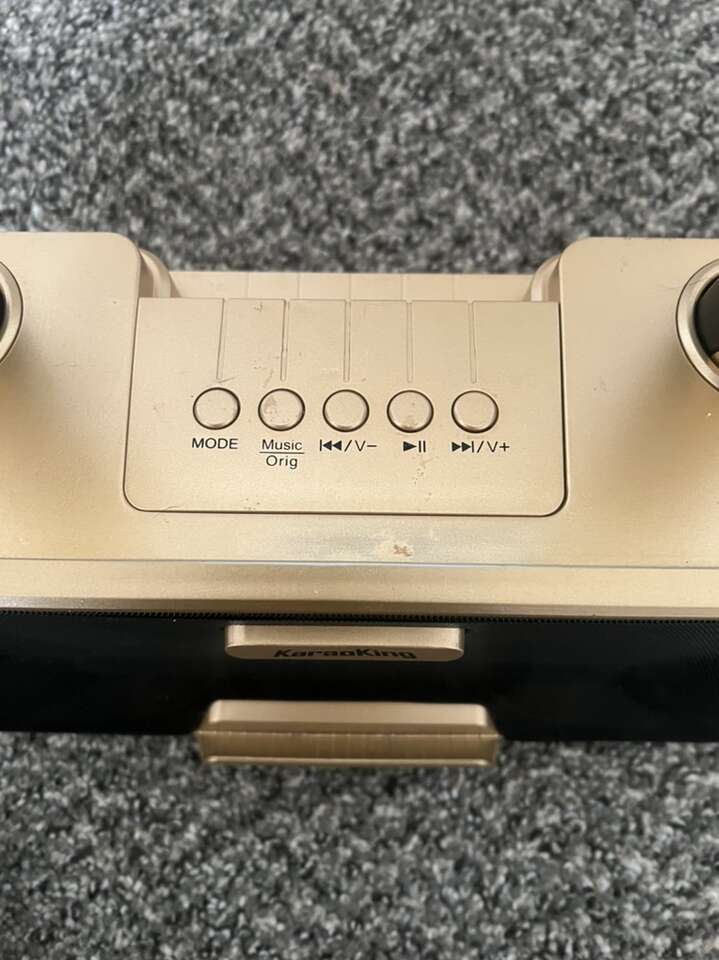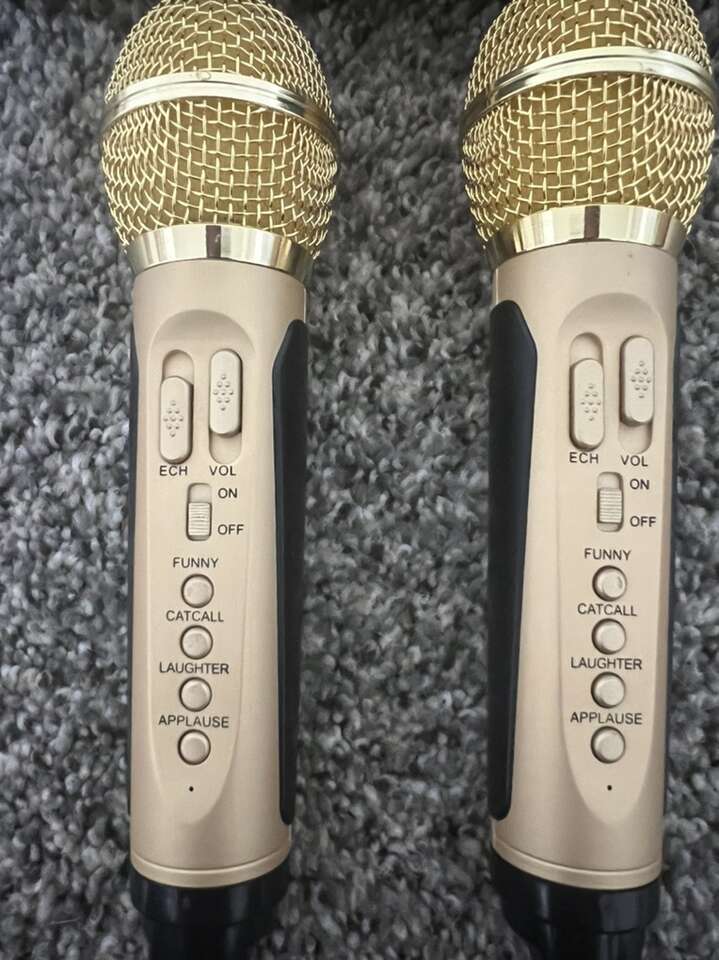 Comes with charging cord, everything works perfectly. Microphones are wireless and have adjustable options. Sync to your phone, play any karaoke song on YouTube for unlimited songs! Plus control the songs from the microphones. Use phone or use the tv hook up! Please text me with any questions