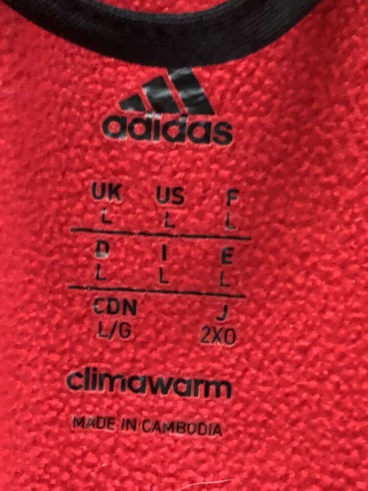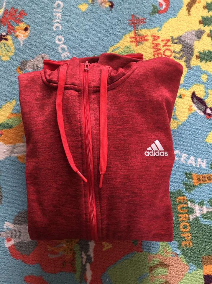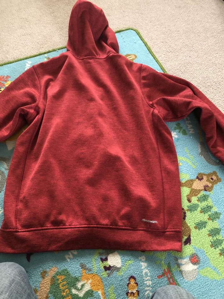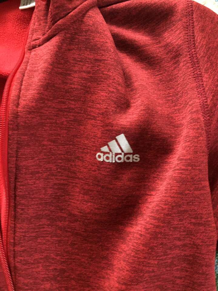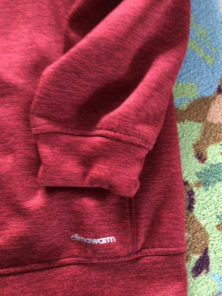 What you’re looking at is a several shades of red Adidas branded climawarm full zip hoodie in excellent used condition!