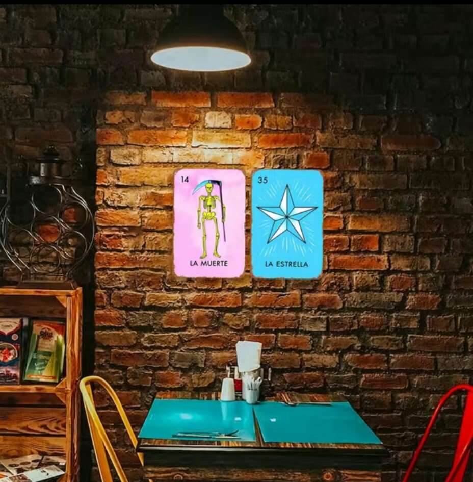 La estrella the Star and El Díablo the devil Loteria Card Mexican Bingo Lottery Metal Tin Wall Decor Sign