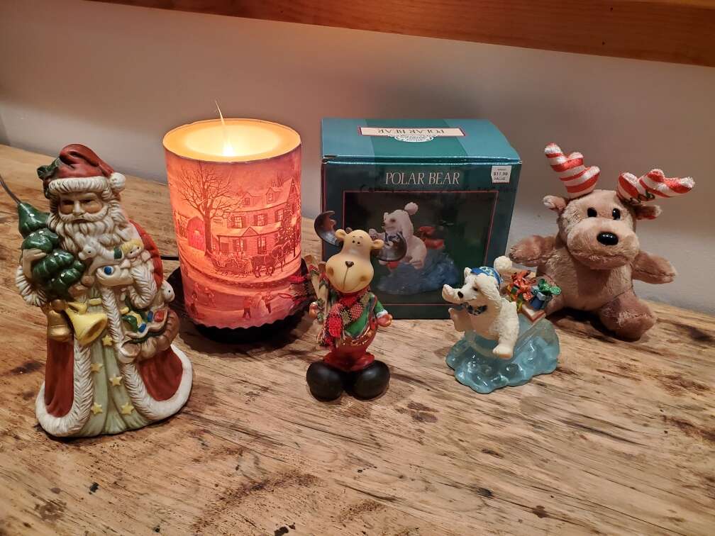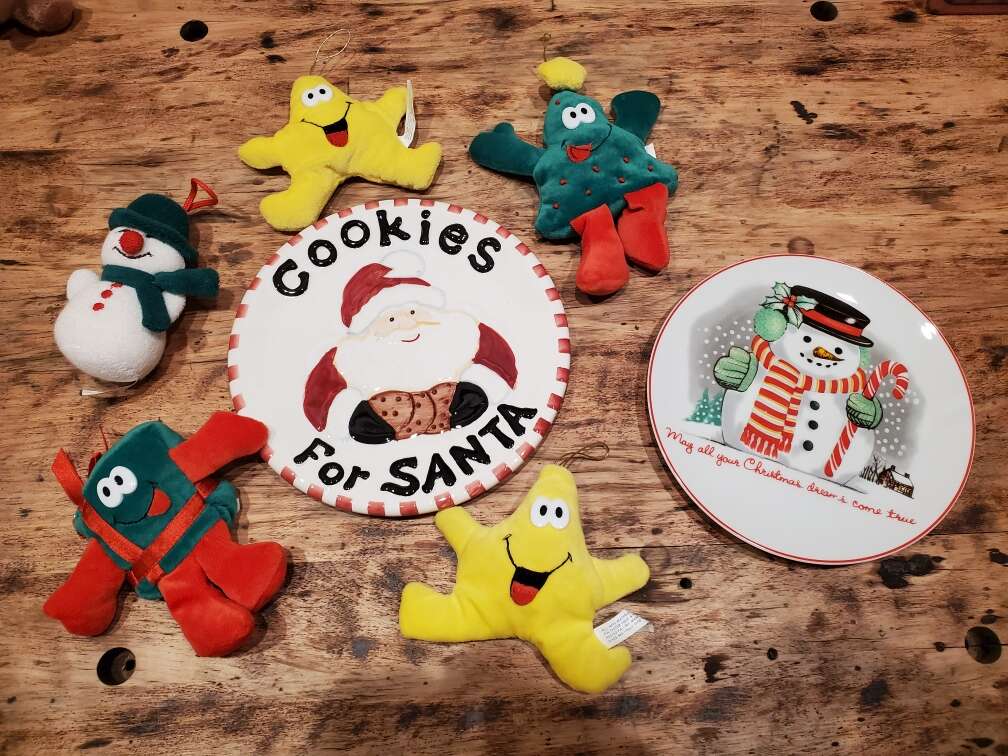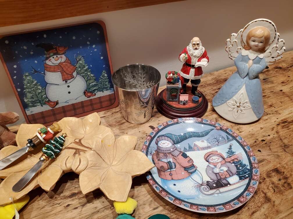Can meet Ogden. Ceramic plates, Cookies for Santa, and Snowmen are really nice and all in like new condition. No chips or scratches. Ceramic angel with gold highlights and 2 ceramic Santa's. Electric plug in light up wax candle with Christmas village scene. Other various Christmas items like hand carved from wood Poinsettia dish. Festive cheese/butter knives, snowman trivet, polar bear.... $8 for everything pictured together!
