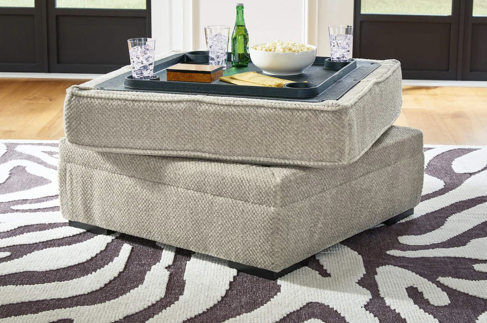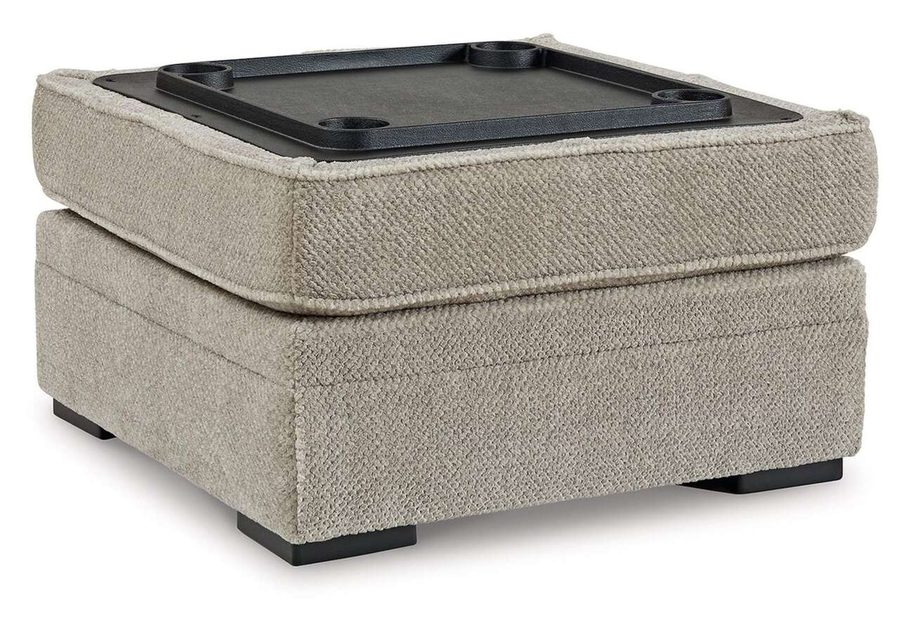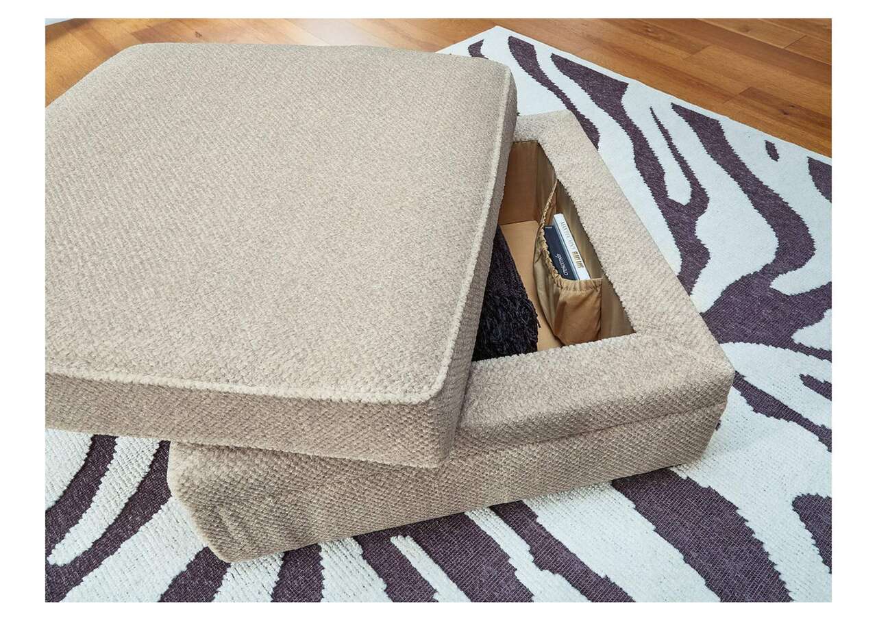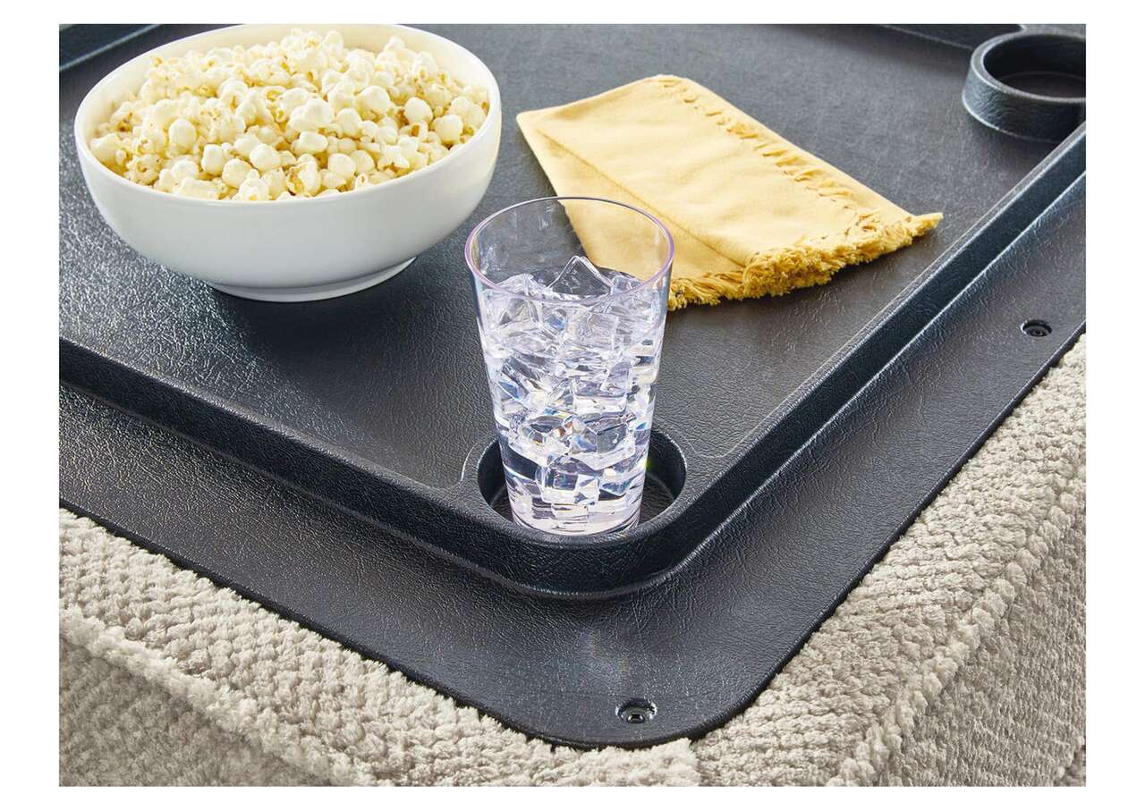 This ottoman with storage caters to your need for contemporary comfort. It’s decked out in feel-good fabric in a versatile hue. The family-friendly ottoman is ideal for hosts with the most, with easy-to-access storage space that keeps throw blankets on hand. Flip the lid to reveal cup holders and make refreshments all the more reachable. Quality time has never been so cozy.Corner-blocked frame