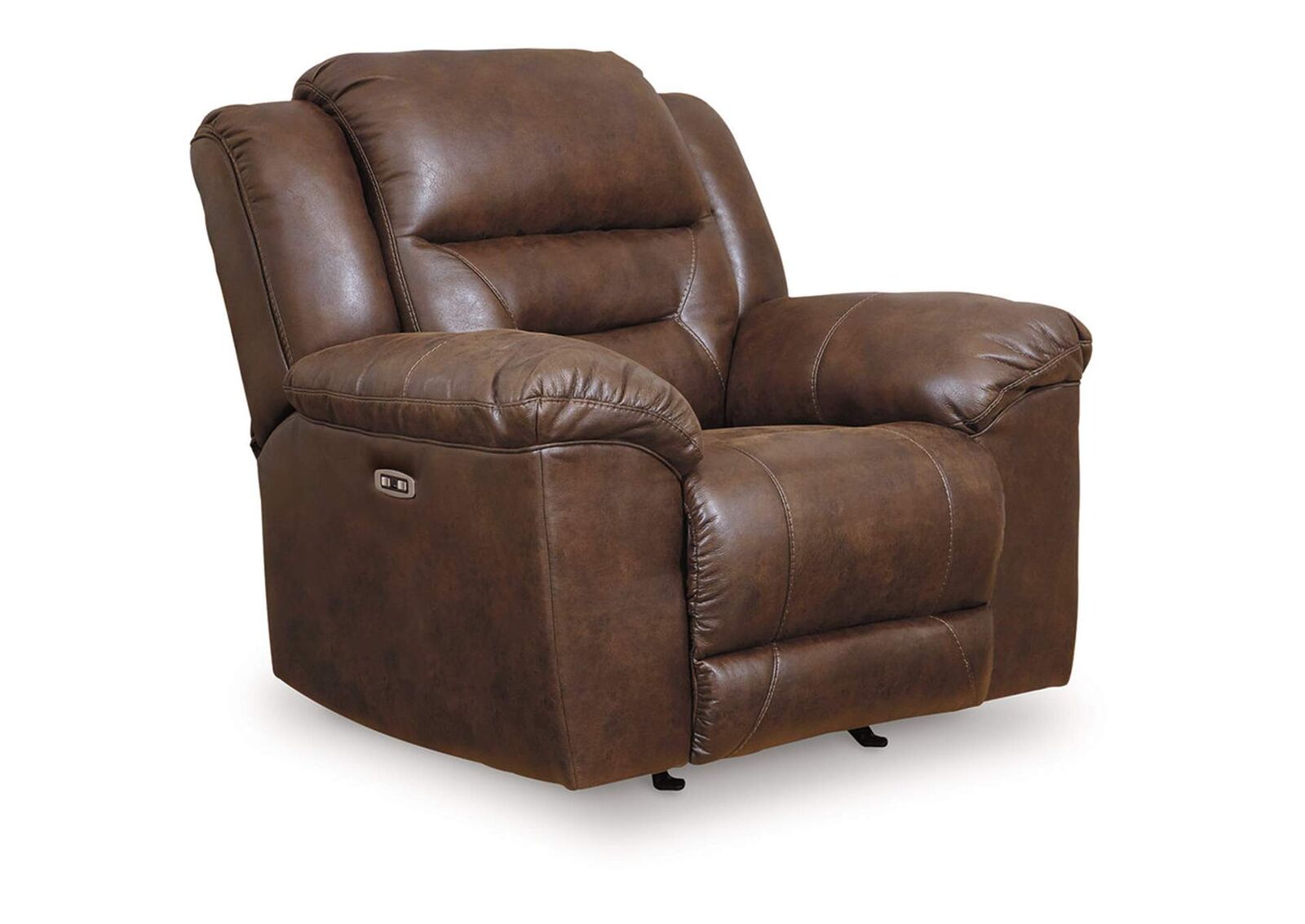 For those that love the cool look of leather but long for the warm feel of fabric, this power rocker recliner delivers both with ease. Its high-performance padded faux leather is remarkably durable and easy to clean, just the thing for family spaces. When it’s time to relax, the one-touch power control puts the perfect position at your fingertips. Channel-stitched back cushions provide indulgent lumbar support for maximum seating comfort—not to mention fashion-forward flair.Corner-blocked frame with metal reinforced seat