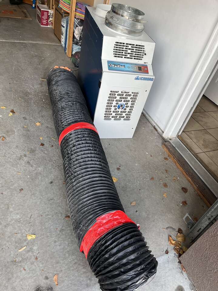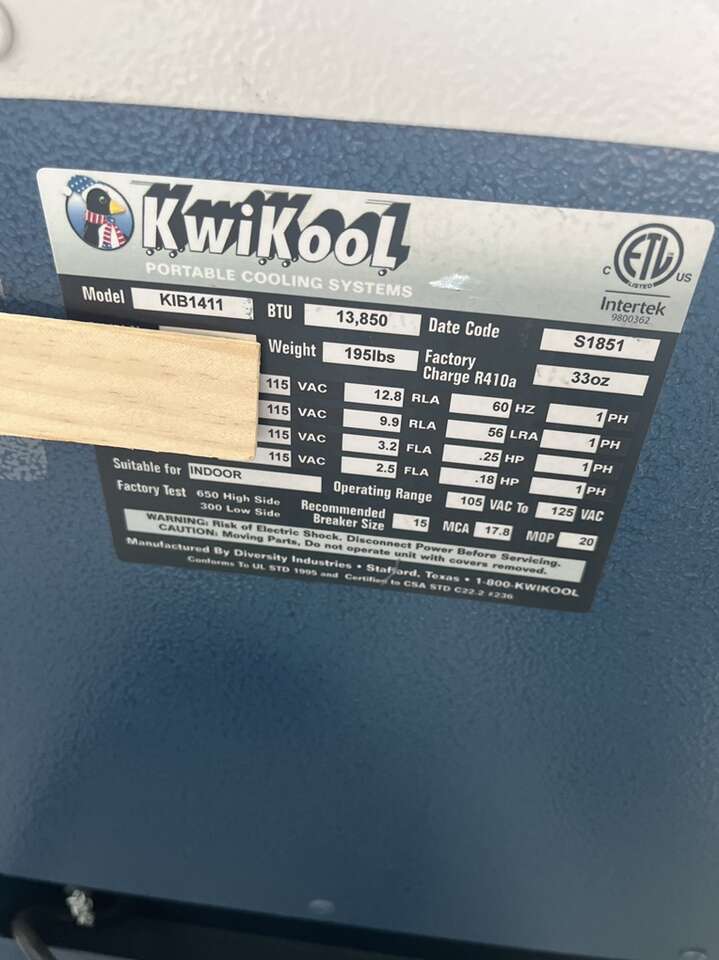 1.1-ton (13,850 BTU) 115V / 15Amp 1 pH Portable Air Conditioner Proudly made in Houston, TX! Ready-to-use right out of the box Gets colder than a spot cooler, comes with built-in accessories that cost hundreds on other machines (condensate pump and return air plenum). Dimensions (WxDxH): 16x36x37, Ship Weight: 286 lbs More info from manufacturer below. The KwiKool KIB1411 is ideal for cooling commercial spaces like server rooms. It provides 14,000 BTUs of cooling power--enough for areas up to 400 square feet in size. It has a 5-gallon condensate tank. This heavy-duty machine is American-made.