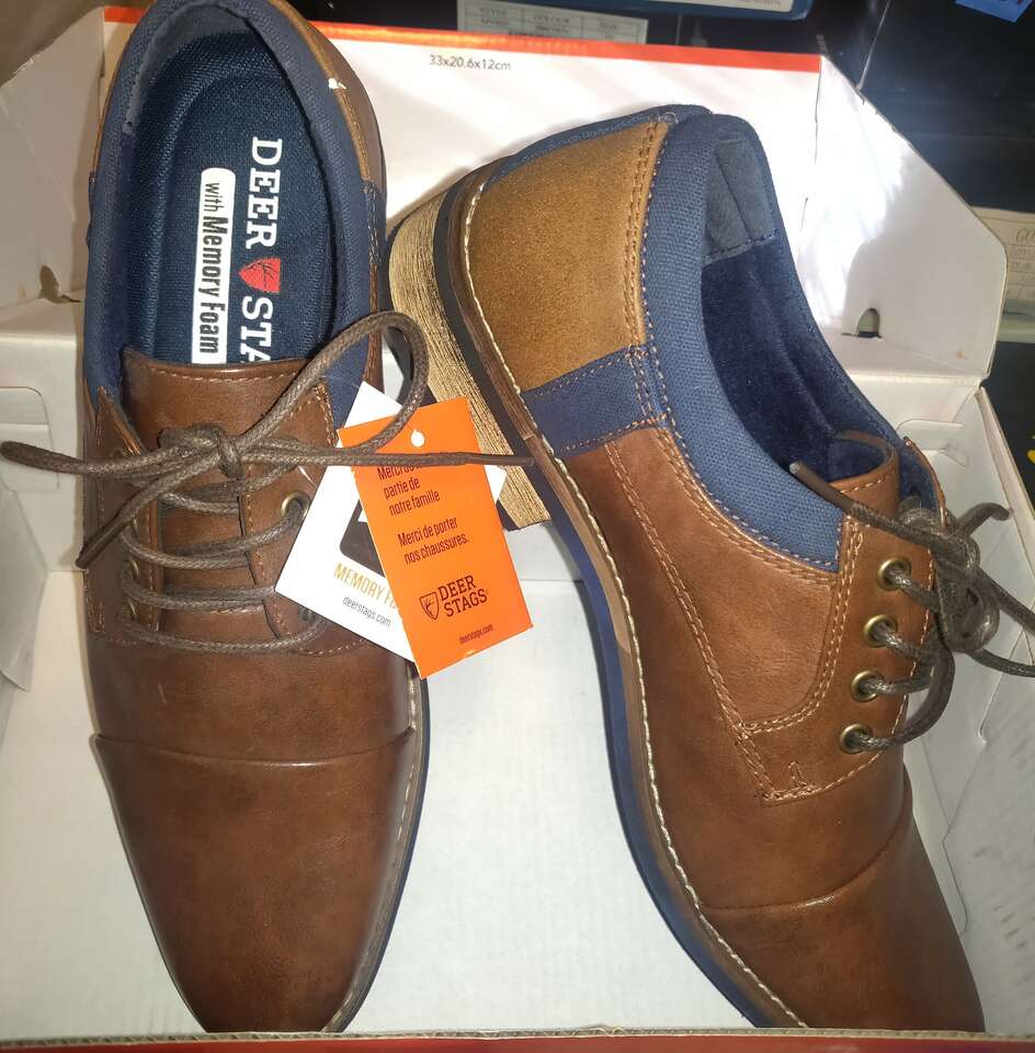 New/boxed with no flaws. Clean. Smoke free home. Nice brown dress shoes size 8. Length: 12" Width: 4" Details: Moisture-wicking fabric lining Removable memory foam sockliner EVA foam outsole.