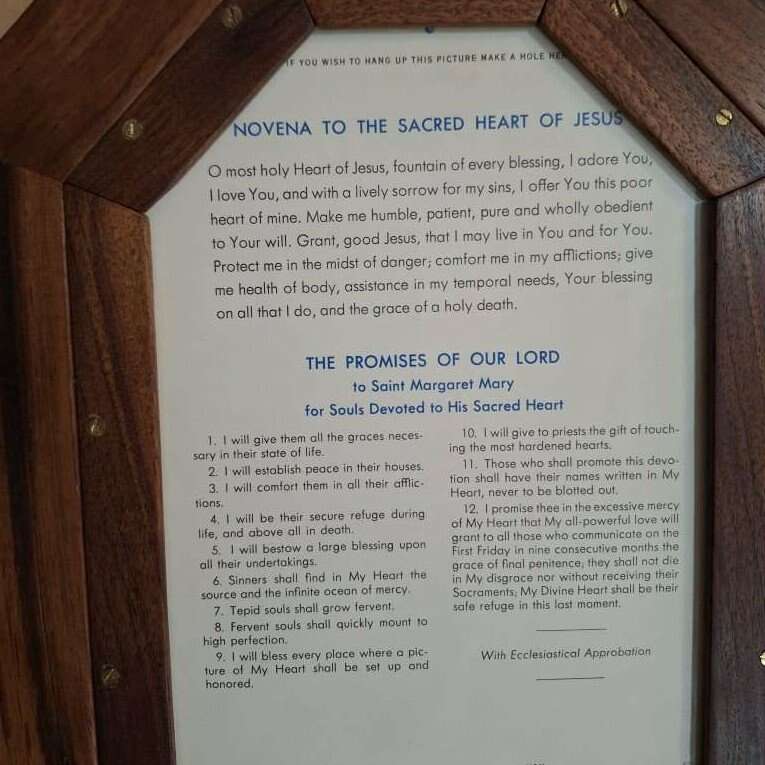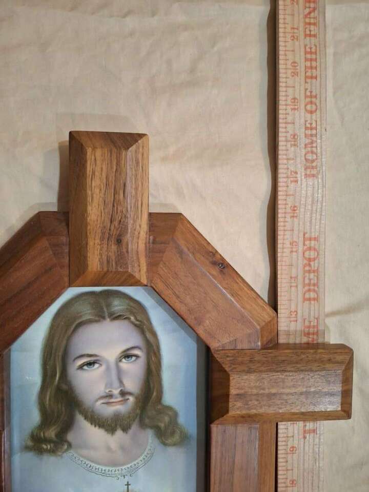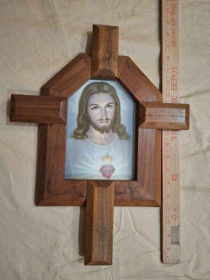 This is a very nice piece. Cross shaped with a picture of The Sacred Heart of Jesus. Wood See picture for details. Nicely framed Special. Hook on back to hang. More information on the back of picture.
