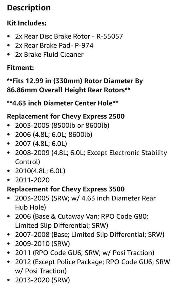 Description- (2) Brake rotors and ceramic brake REAR of 2003-2020 Chevy Express/GMC Savana 2500/3500 8-Lug (SINGLE REAR WHEEL ONLY/DOES NOT FIT DUALLY). See photos for more product information and specifications.