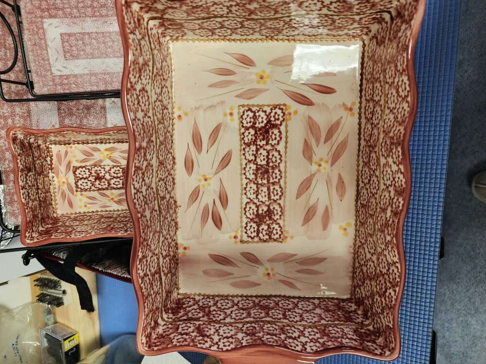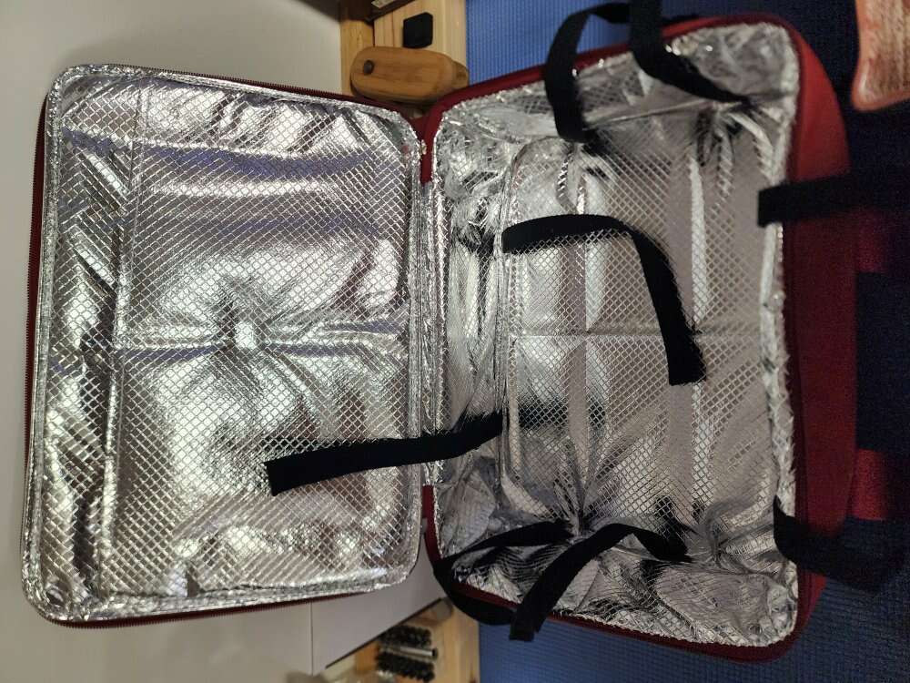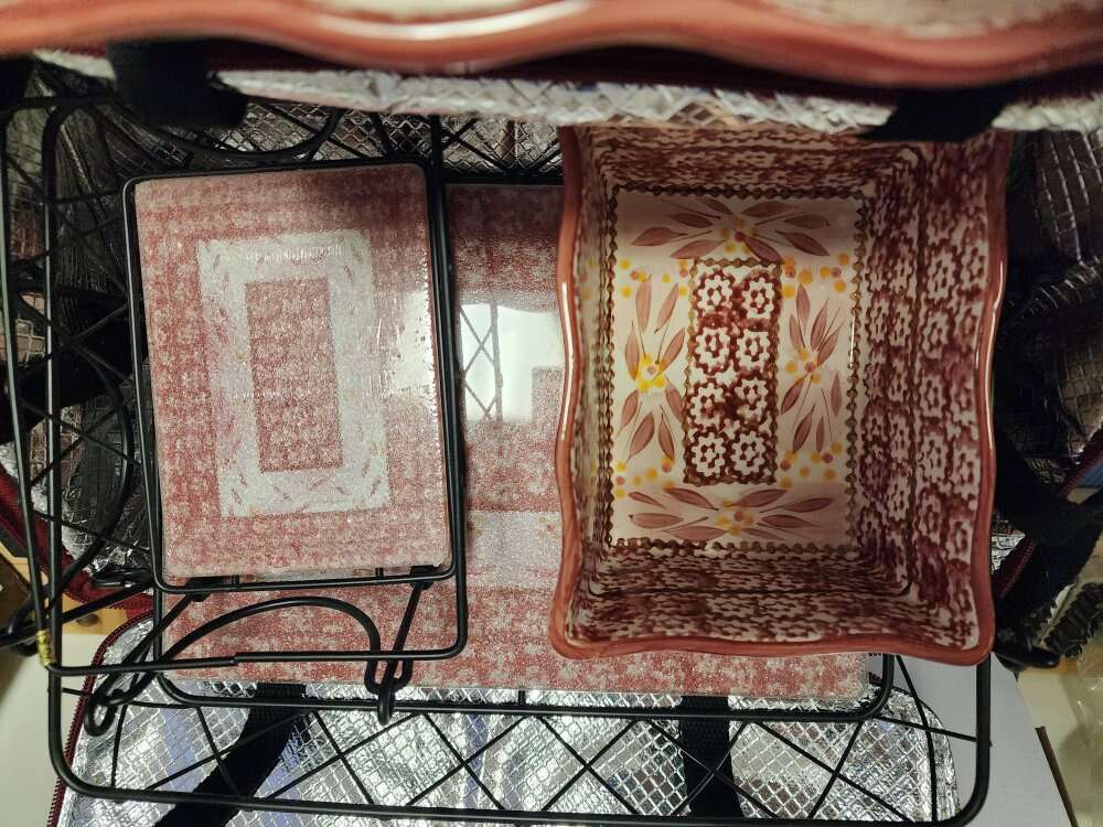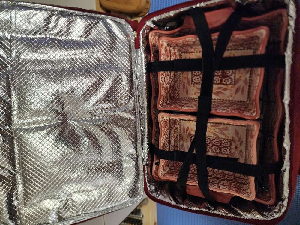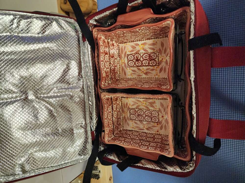 1 large casserole with carrier and trivet and 2 smaller casseroles with carriers and trivet in insulated carrier.