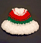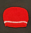 3 Handmade Crocheted baby hats. One is red, green & white, One is red with a white stripe & One is blue with white stripes. Size Preemie