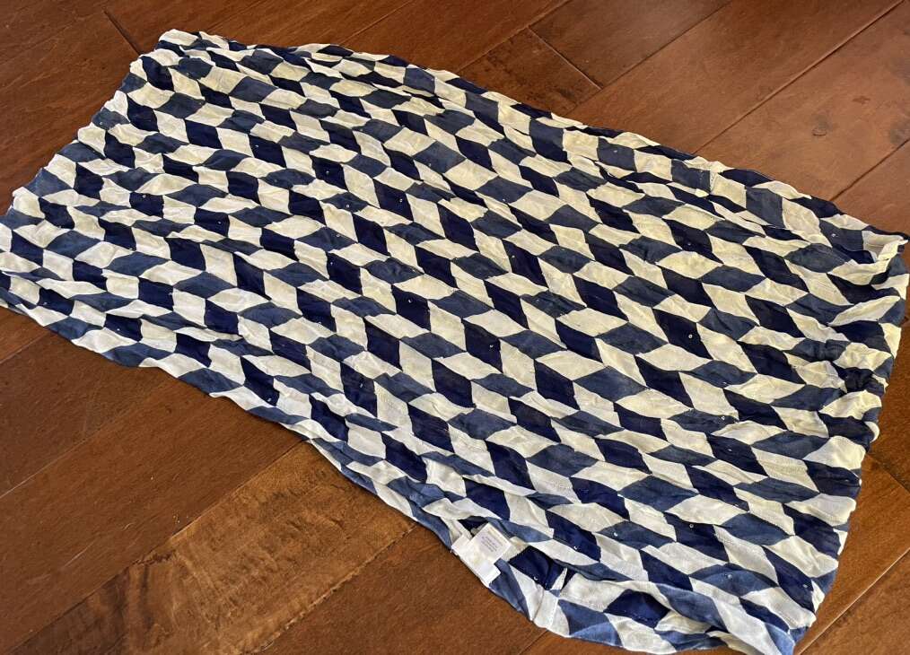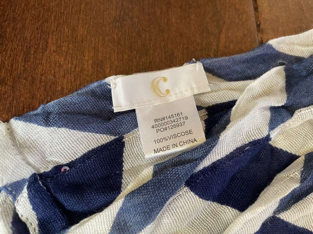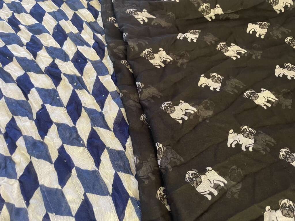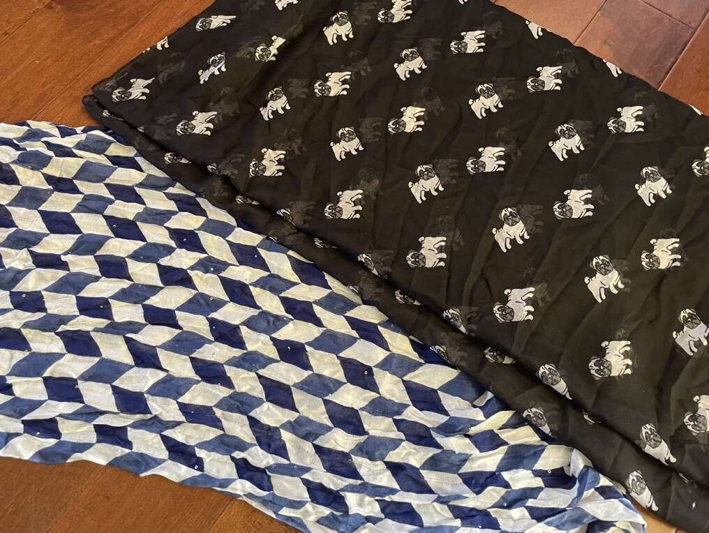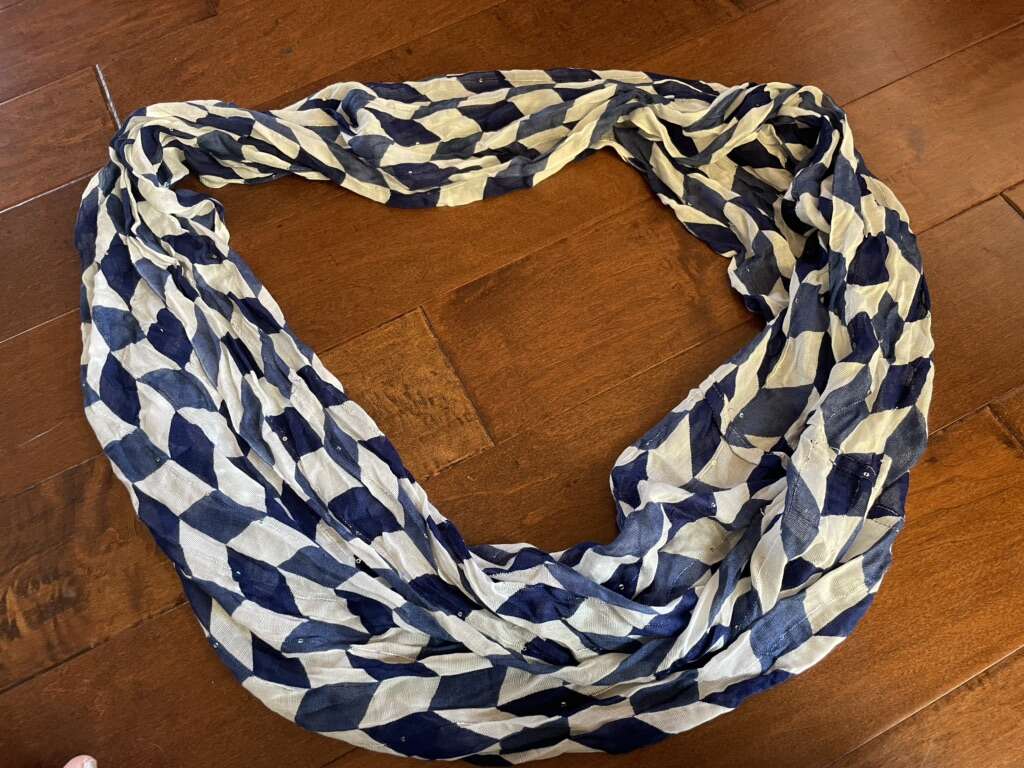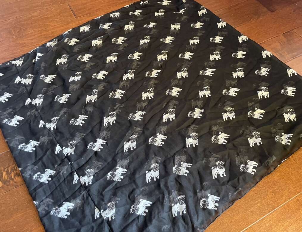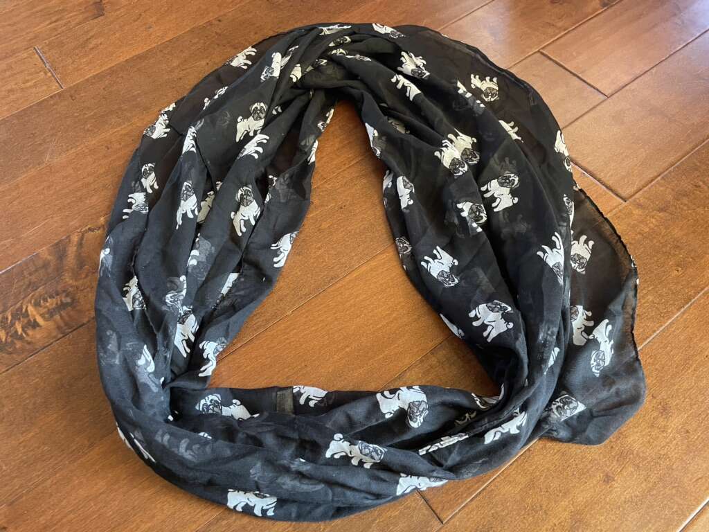 I have 2 lightweight infinity or circle scarves. One is white with blue diamond shapes. It has a few sequins that add a small amount of sparkle. It is 22 inches wide and would be 68 inches long if it was spread out instead of a circle. The other one is black with cute little pug dogs on it. It is about 38 inches wide and would be 74 inches long if it wasn’t a circle. Just $3 each or take them both for $5. See my other ads for jewelry, artwork, home decor and more.