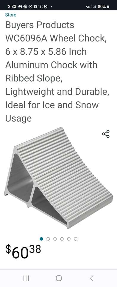 Wheel Chock 6x8.75x5.86 New. Aluminum Chock with Ribbed Slope Lightweight and Durable Ideal for ice and snow usage $35 each I have 30 available.