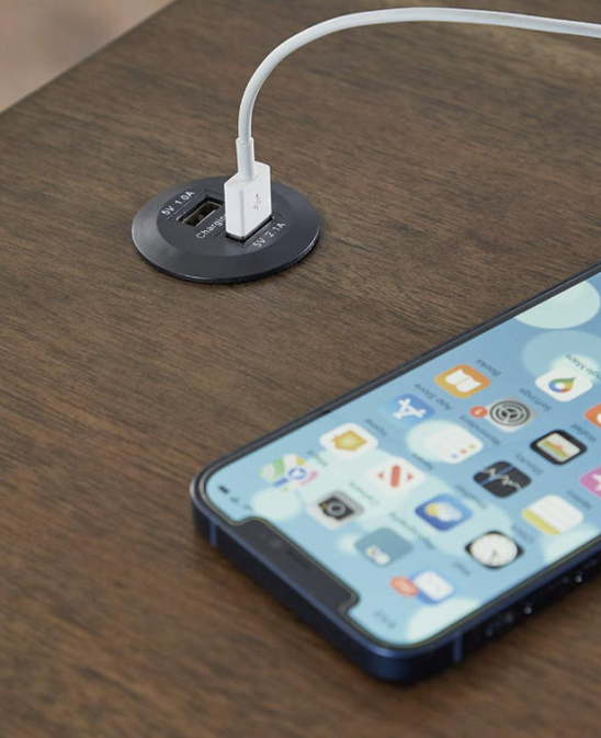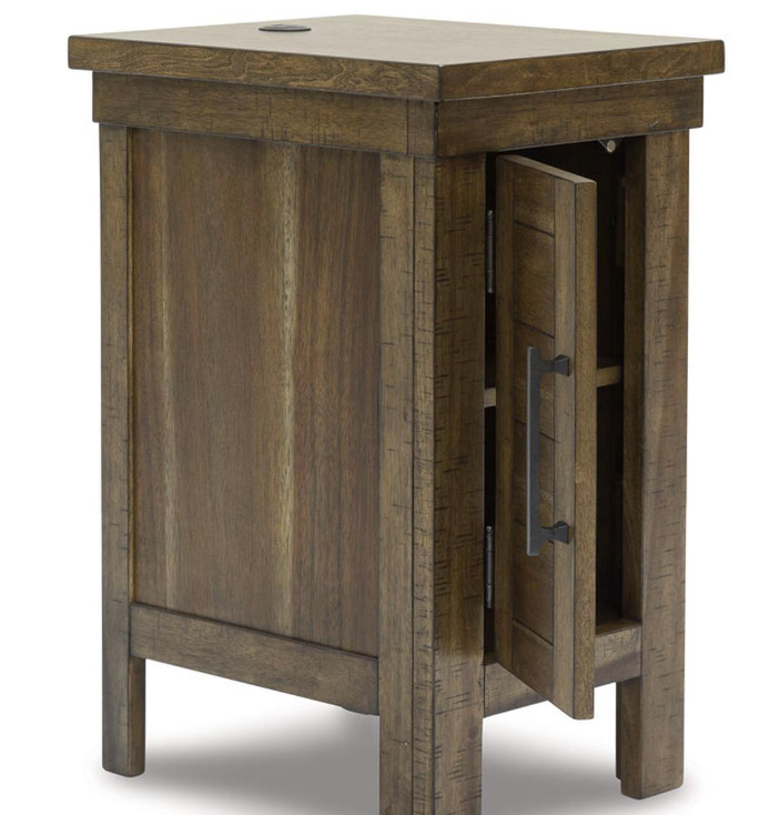 This chairside end table might appear simple at first sight. But a closer look reveals beauty in the details. With a plank-effect cabinet door, a tobacco brown finish and antiqued bronze-tone hardware, it’s simply beaming with charm. This side table's cabinet and tabletop space, along with USB charging, will serve you well for years to come.Made with acacia wood solids, veneer and MDF substrate