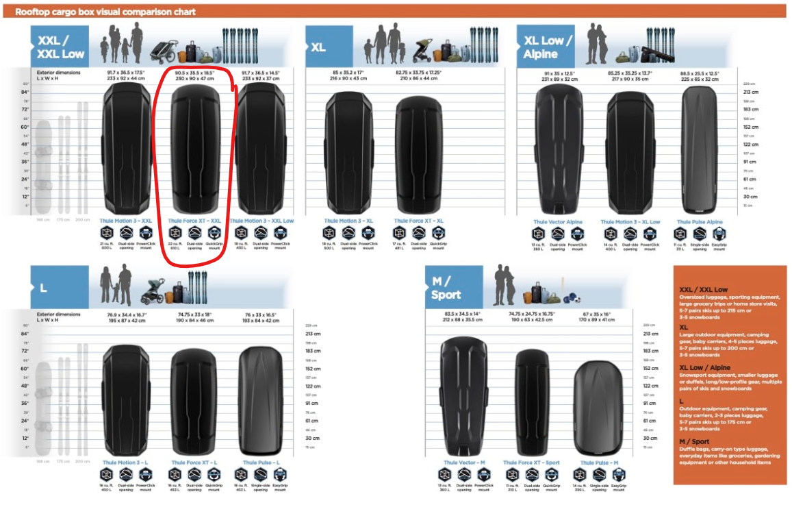 For more box info and specifications: https://www.thule.com/en-us/cargo-carrier/car-top-carrier/thule-force-xt-xxl-_-635901