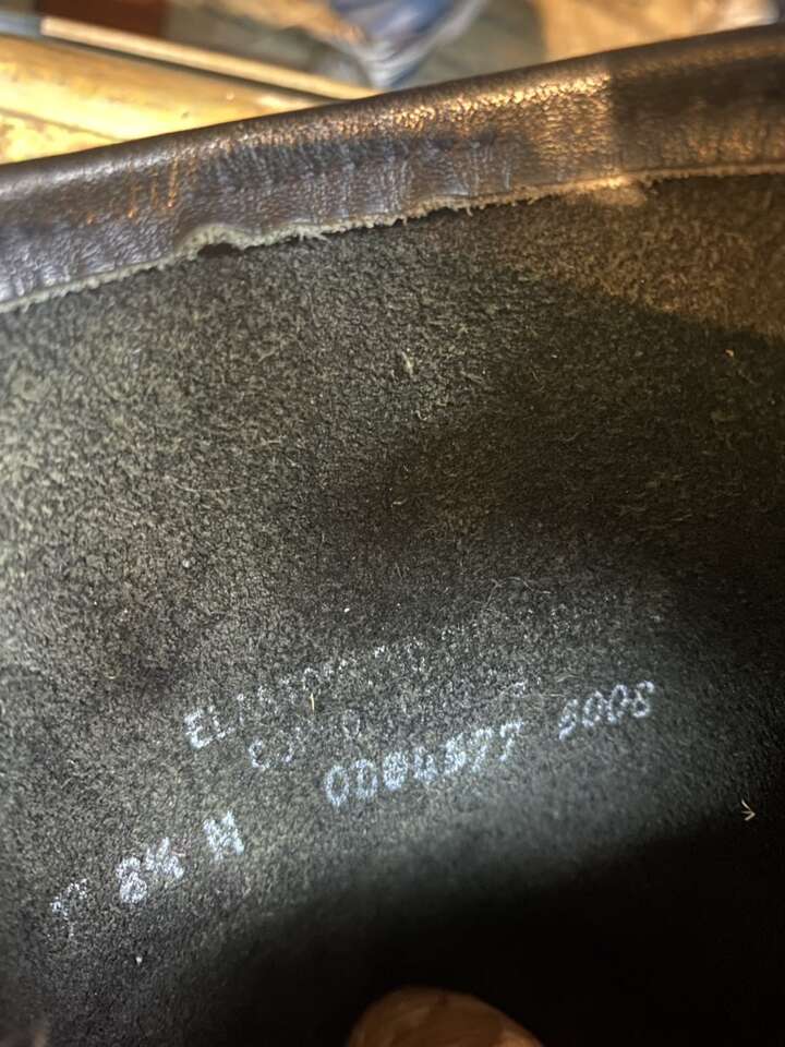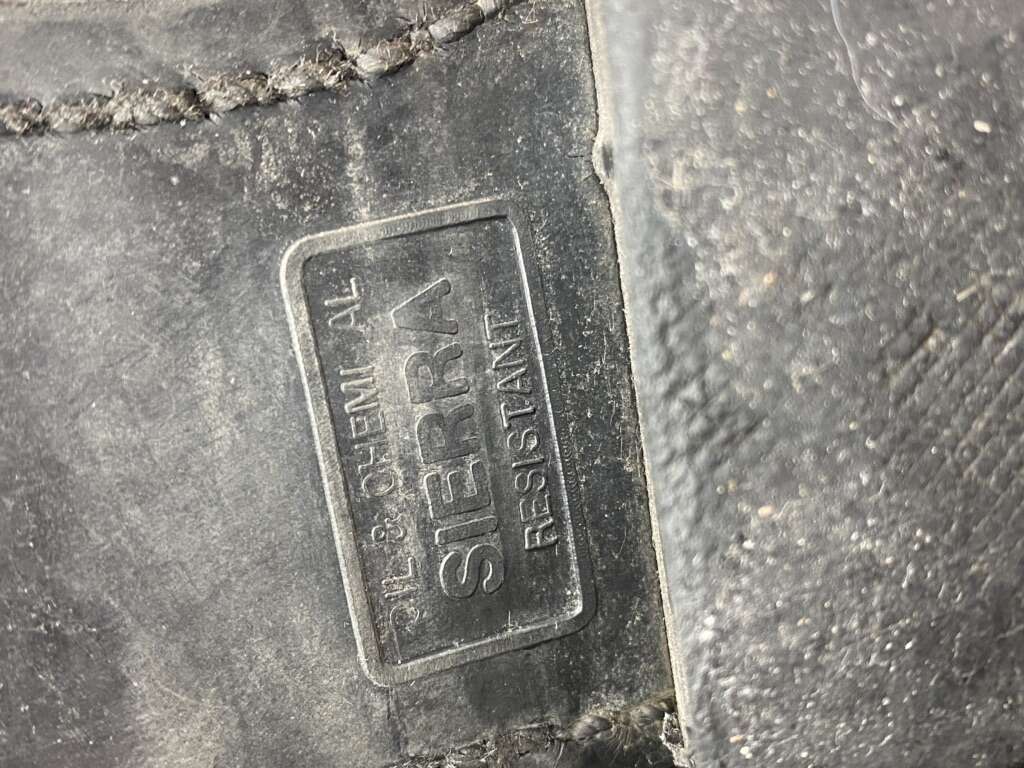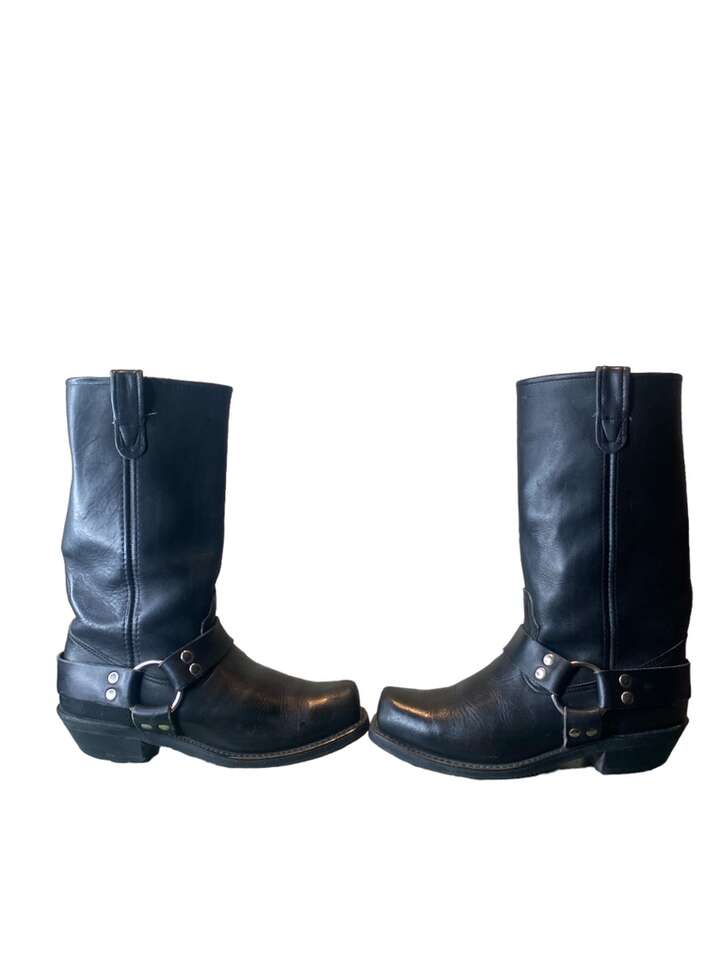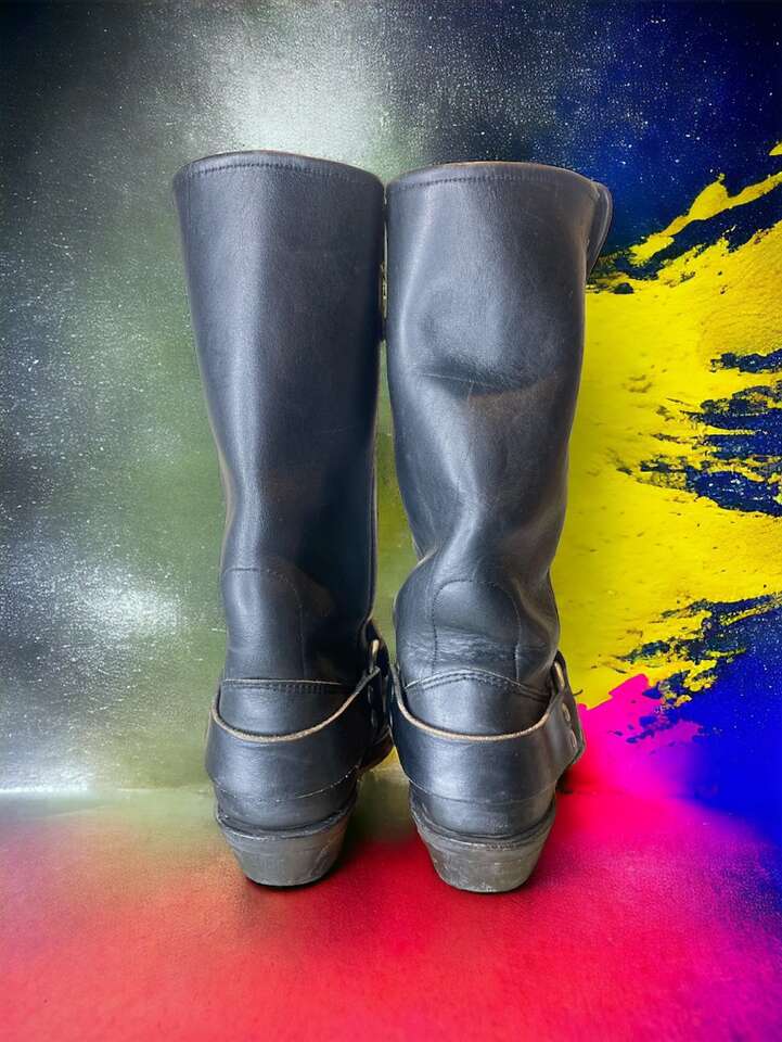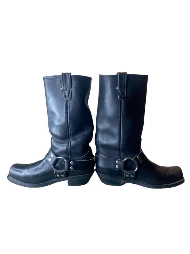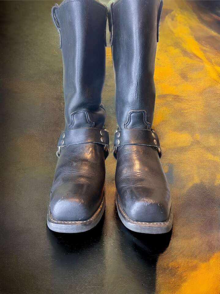Made in the USA with global parts. Black Full Grain Leather Square Toe Unlined Silver Ring and Rivets Sierra 150 with Orange Plug Outsole 1⅞ Inch Heel, shaft 12.75 tall, scuffing on toes and right boot outside.