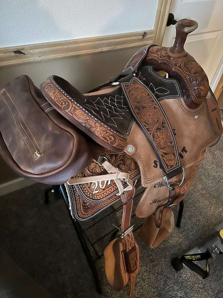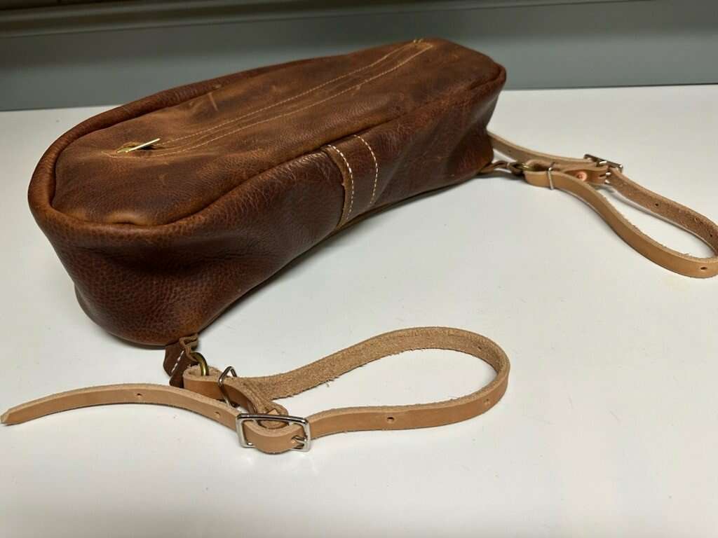 Hand sewn leather cantle/saddle bags. 2 sizes available. 16" long x 6" wide x 6" deep and 19" long x 6" wide x 6" deep. $85 each