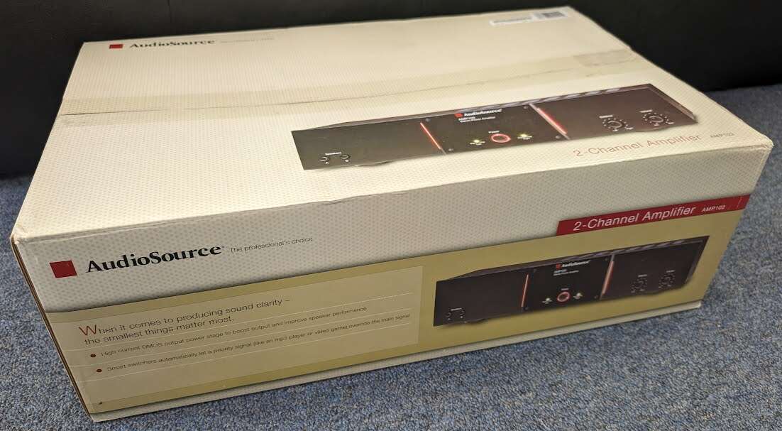 AudioSource AMP102VS 2 x 55 Watts Amplifier; Black; Class A or B amplifier design using high efficiency toroidal transformers; Features triple darlington output stages for high current delivery, as well as dual differential topology for high audio accuracy; Rear mounted treble and bass controls as well as the classic AudioSource rear mounted level control or front panel trim control feature; Rack mount hardware for custom installation options; 55 Watts per channel into 8 Ohms; 75 Watts per channel into 4 Ohms; As a bridged mono amplifier; Rated at 160 Watts into 8 ohm loads; UPC 041087906694; Dimensions 16.56" x 10.31" x 3.75"; Shipping Dimensions 20.00" x 18.00"x 7.50"; Weight 14.00 lbs; Shipping Weight 16.60 lbs