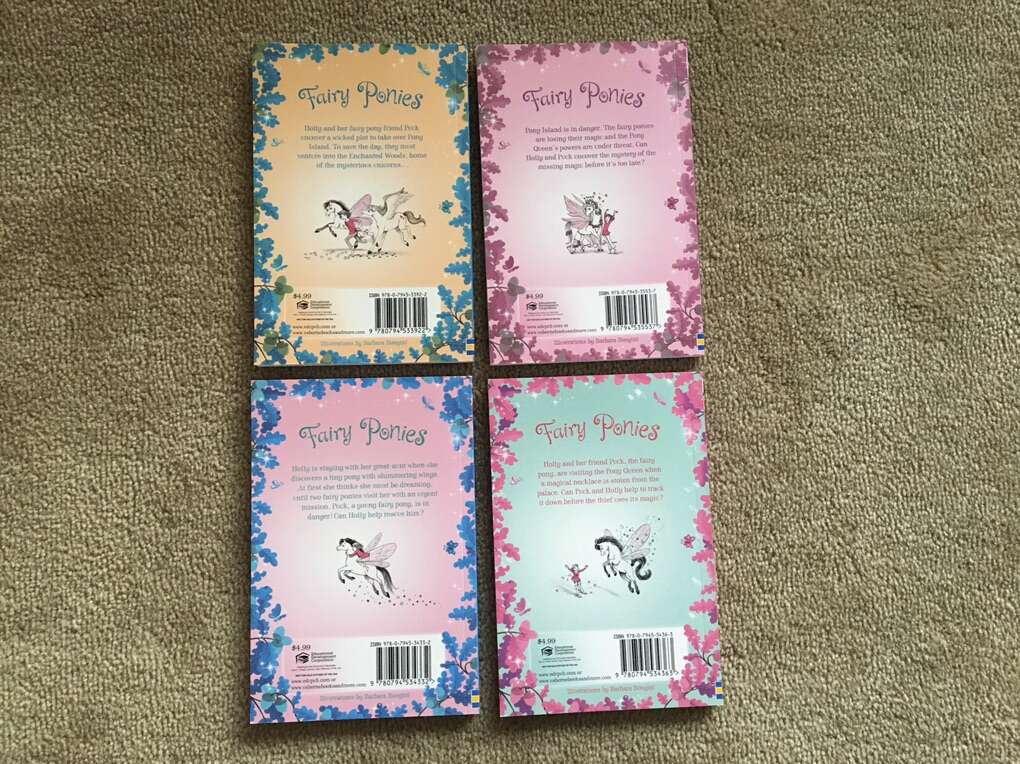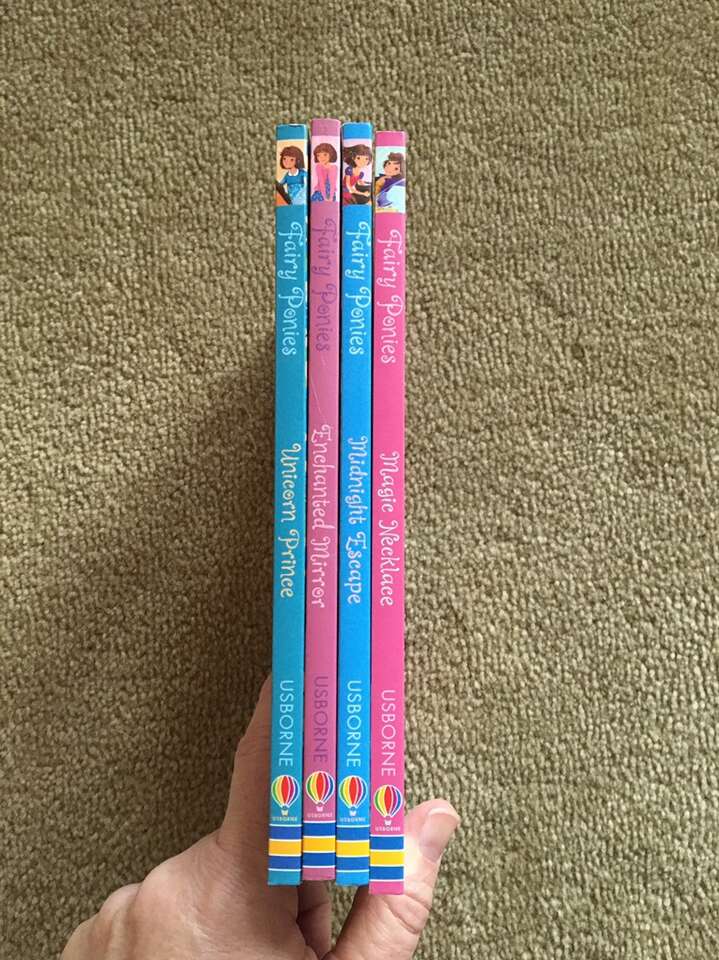 4 Usborne Fairy Ponies Books, by Zanna Davidson: Unicorn Prince, Enchanted Mirror, Midnight Escape, and Magic Necklace. Published 2014. Early chapter books. Sturdy paperbacks in excellent condition. Text only. Cash or Venmo.