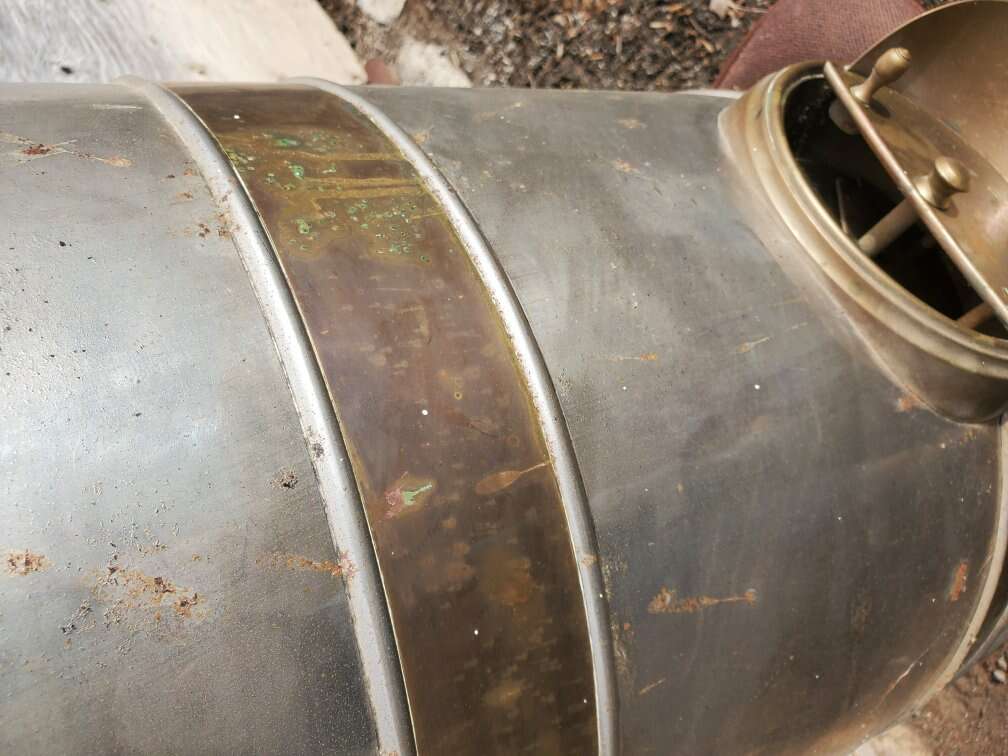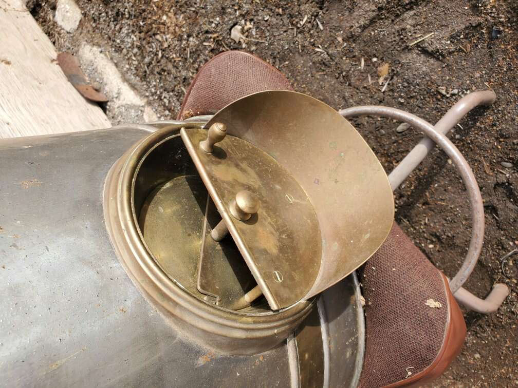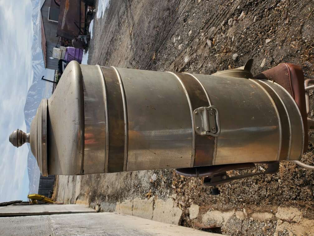 I bought this in Jackson Hole close to 30 years ago. I was told it came out of an old store there but can't verify that. It's close to 37 inches tall, 18 wide and 18 deep. Has a flat back to sit along the wall and the inside bottom is tapered so all the coffee will slide out. It's been in my shed since I brought it home and needs to be polished back up. Brass rings and the spout and turning pieces are brass. Looks like it was Nickle plated. 350.00 CASH ONLY OBO