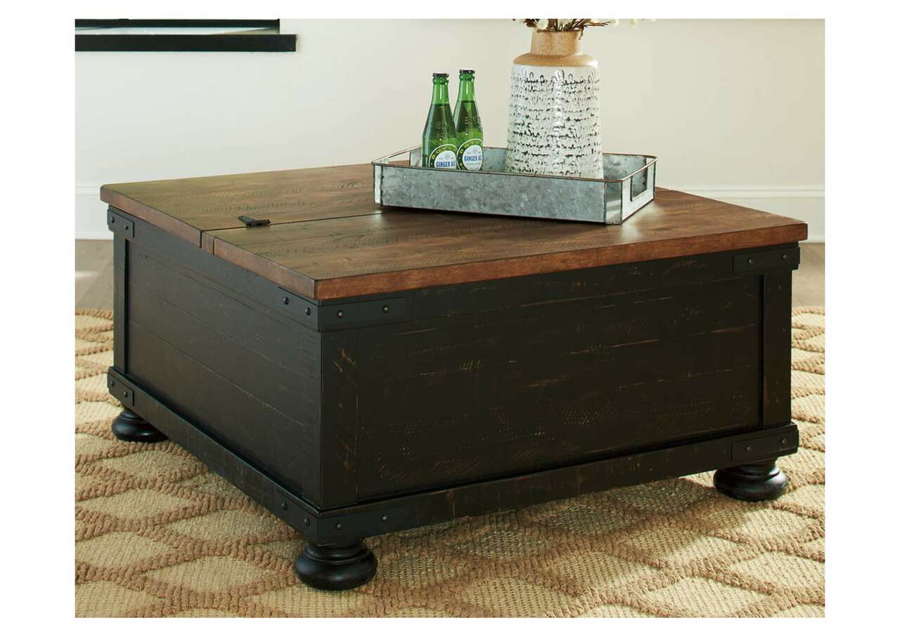 To those with an eye for the best in rustic farmhouse living, the two-tone Valebeck square coffee table doubles up on form and function. Clever split style design pairs a spring lift top with hinged lid revealing a handy storage compartment. Designer touches include plank-effect styling, distress marks and industrial brackets for added character.Made with pine veneers, pine wood and engineered wood