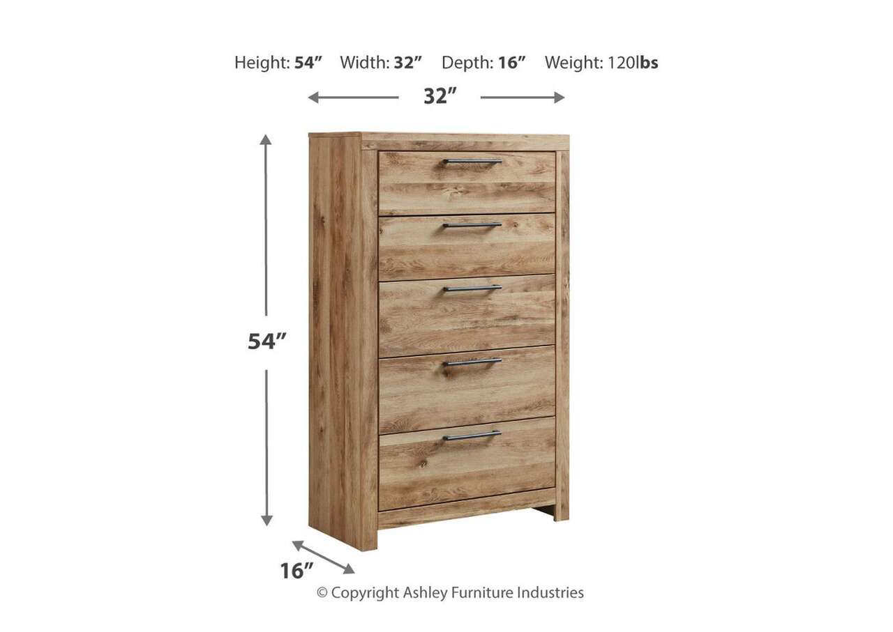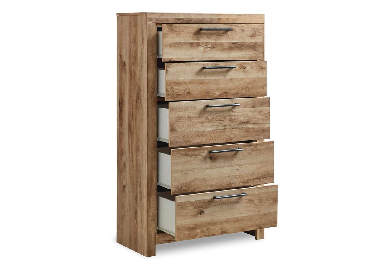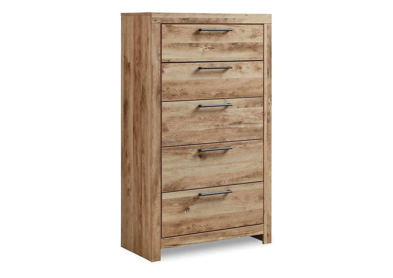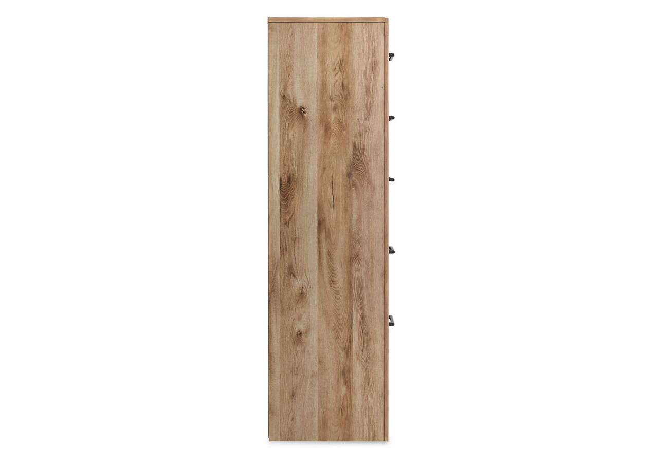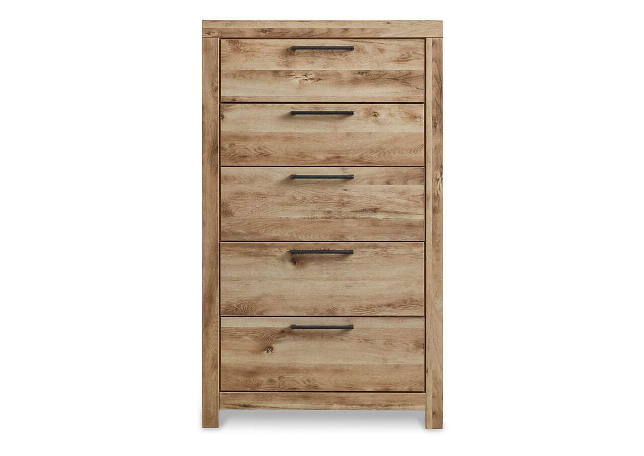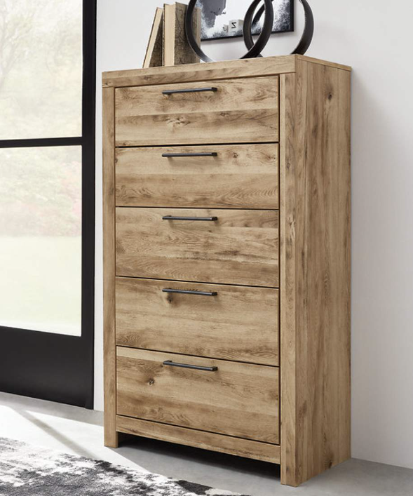 Inspired by natural beauty, refined to perfection. This chest of drawers brings cozy outdoor vibes to your bedroom with its warm and inviting golden rustic finish. Handles in an antiqued gunmetal hue adorn the five drawers on its framed front, adding an industrial touch to the simple, streamlined design.Made with engineered wood (MDF/particleboard/plywood) and decorative laminate for the right balance of affordability and durability