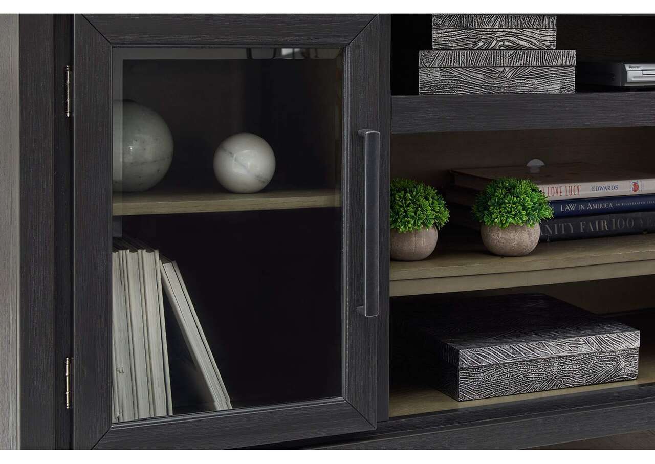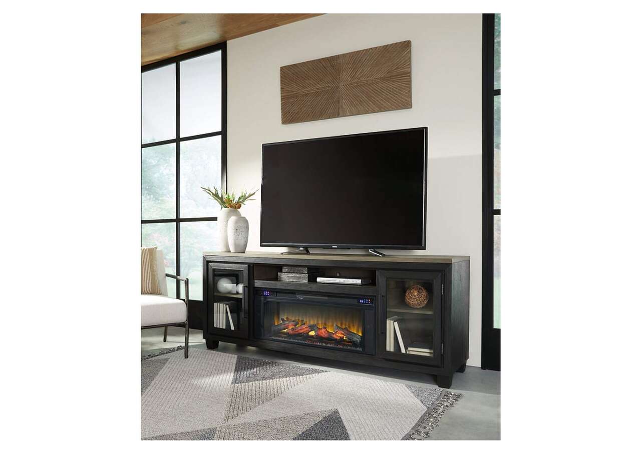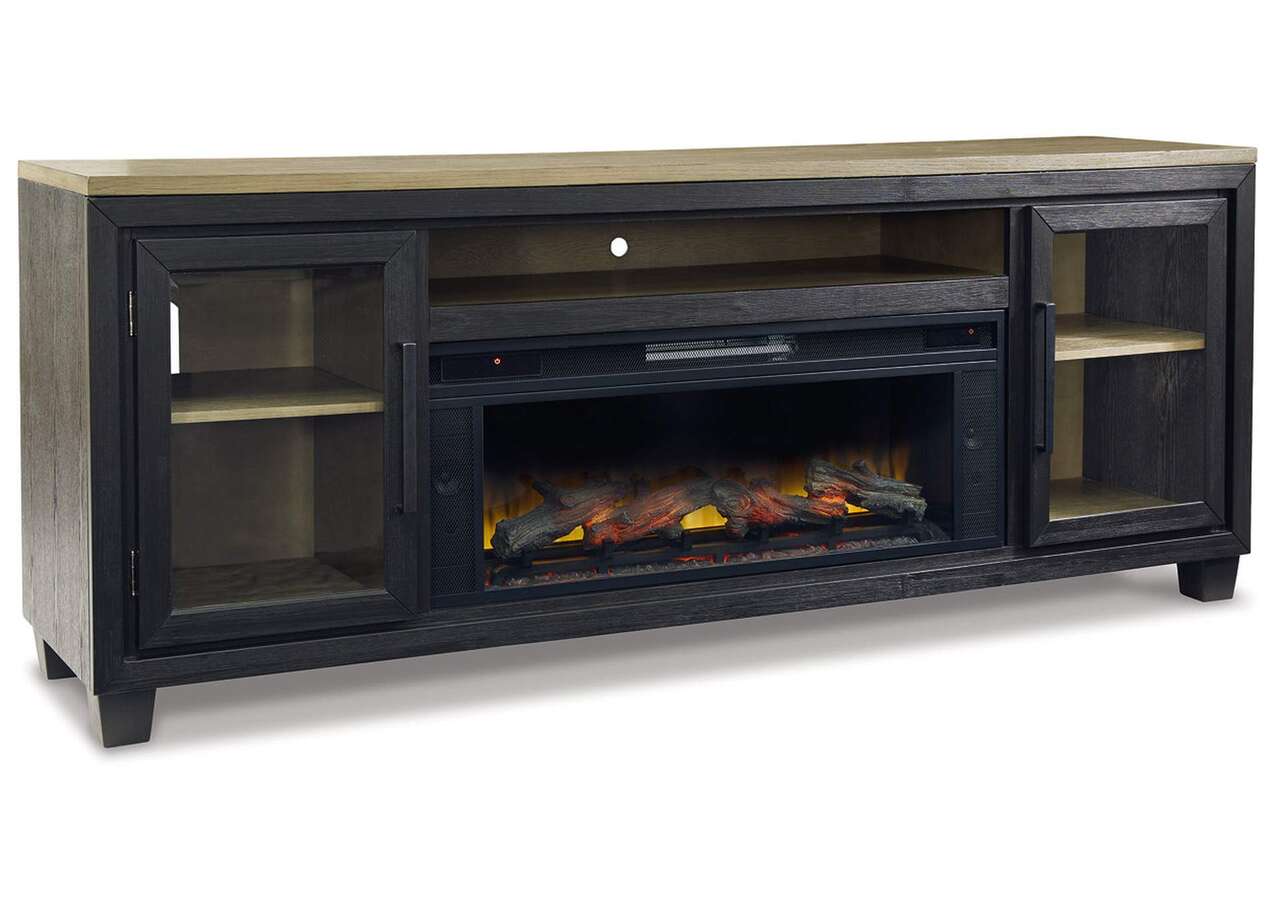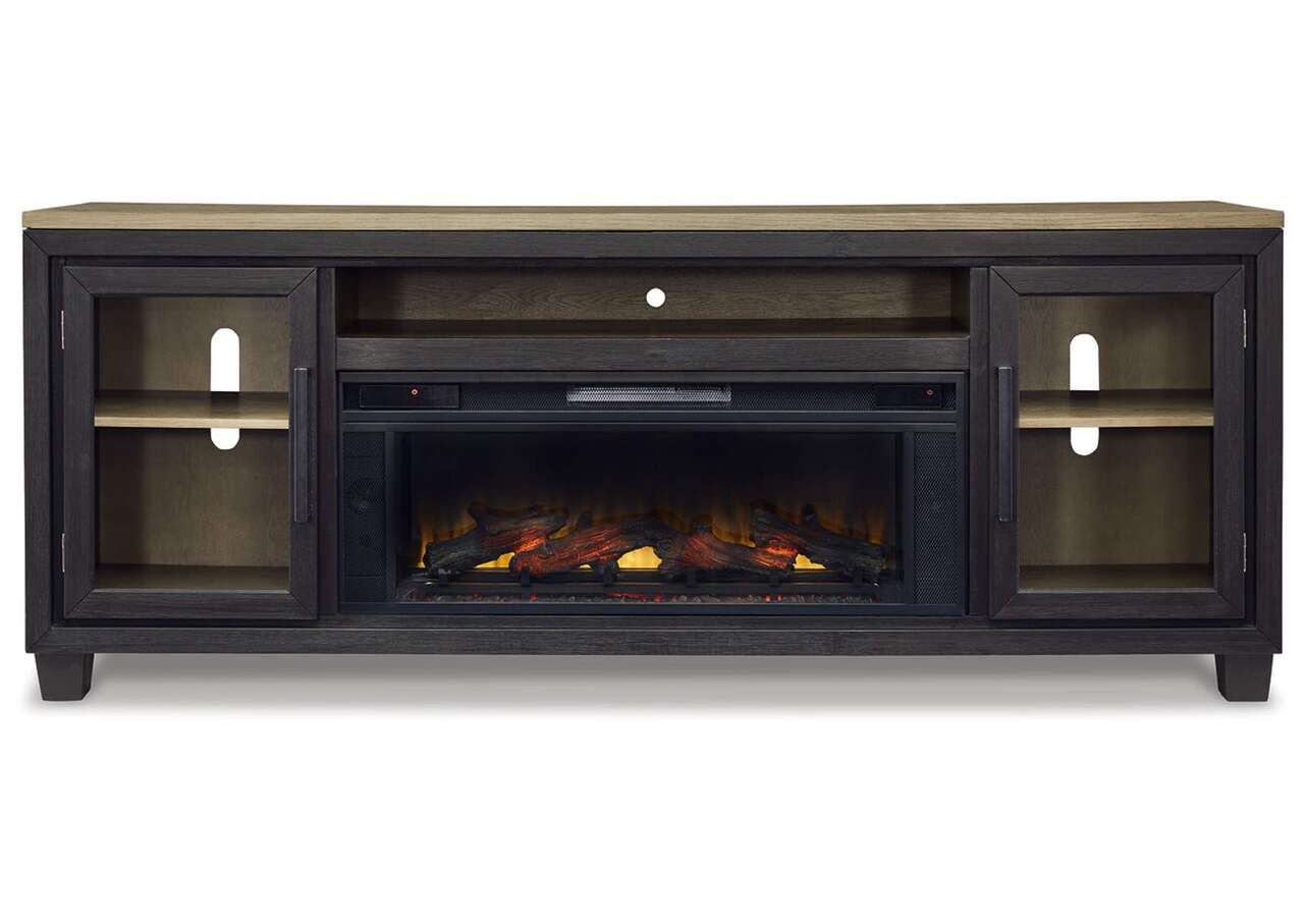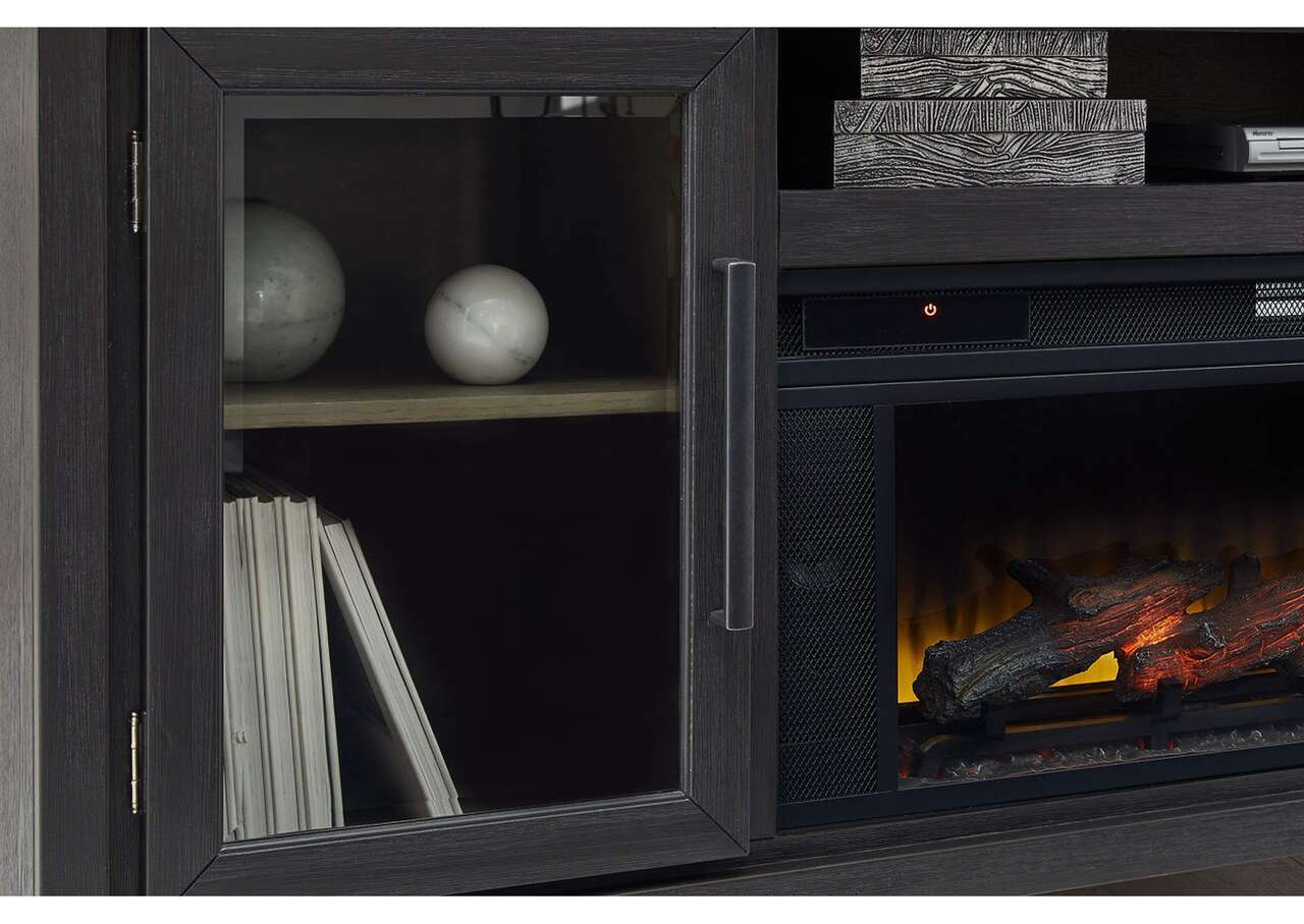 This TV stand with fireplace is rustic, casual contemporary style simply done right. Its two-tone color scheme features a rich brushed black finish accented with a dusty grayish brown wood tone. With two glass-front cabinets (each with an adjustable shelf), an open cubby and a removable center shelf, it offers plenty of storage to house all of your electronic needs. For added viewing pleasure, the electric infrared fireplace brings the cozy feeling of a fireplace without the work or worry. Just the thing for a perfect night in.Made with wood, oak veneer and engineered wood
